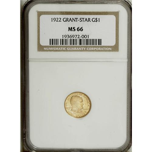 <B>1922 G$1 Grant with Star MS66 NGC.</B></I> Despite the apparent asymmetry on both sides of this design, Laura Gardin Fraser's work is remarkably attuned to the needs of coinage, with areas of high relief that do not intersect. Lemon-yellow and honey-gold hues harmonize on the surfaces of this highly lustrous example. Boldly defined with hardly any marks on the well-preserved surfaces.<BR><BR><b>Shipping:</b> Coin/Currency (<a target="_blank" href="http://www.heritageauctions.com/common/shipping.php">view shipping information</a>)