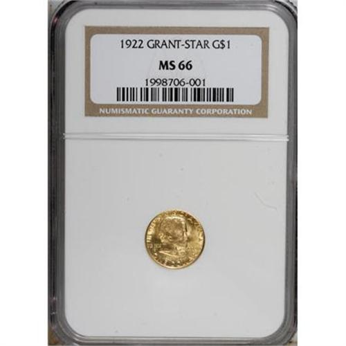 <B>1922 G$1 Grant with Star MS66 NGC.</B></I> The appealing surfaces are interestingly patinated in a lighter gold color than normally seen on these pieces, almost a silver-gold hue. Gorgeous luster sweeps both sides of this satiny piece, and singular abrasions are expectedly nil. The concept of stockkeeping units might not have existed at the time, but marketing was alive and well when the Grant with Star gold dollars and silver half dollars were created. <BR><BR><b>Shipping:</b> Coins & Currency (<a target="_blank" href="http://www.heritageauctions.com/common/shipping.php">view shipping information</a>)