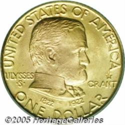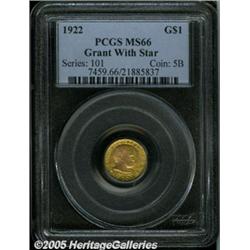 <B>1922 G$1 Grant with Star MS66 PCGS.</B></I> Attractive green-gold coloration and typically bold definition help propel this frosty example to solid premium Gem status.