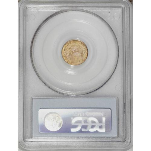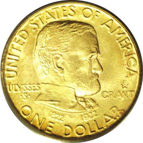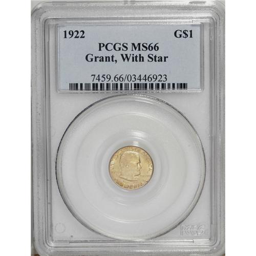 <B>1922<G$1> Grant with Star MS66 PCGS.</B></I> The Grant commemorative silver and gold coins have identical design motifs, with the sole exception of the denomination. Even the two varieties are shared by the half dollar and gold dollar issues. This example is a brilliant Premium Gem with rich orange-gold luster and hints of pale lilac toning on the reverse.