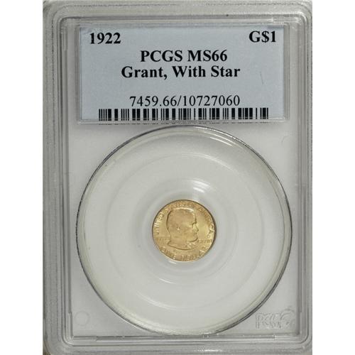 <B>1922 G$1 Grant with Star MS66 PCGS.</B></I> This is a highly attractive Grant gold dollar commemorative With Star variety. Even lemon-gold color bathes both sides that emit dazzling luster, and the design elements are emboldened from a powerful strike. Close examination reveals no significant marks. Premium quality throughout.<BR><I>From The Twin Hollows Collection, Part Two.</B></I><BR><BR><b>Shipping:</b> Coins & Currency (<a target="_blank" href="http://www.heritageauctions.com/common/shipping.php">view shipping information</a>)