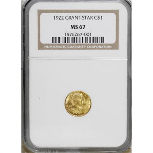 <B>1922 G$1 Grant with Star MS67 NGC.</B></I> A pleasing mix of peach-gold and mint-green patina bathes each side of this highly lustrous Superb Gem. A well executed strike leaves excellent definition on the design features, further enhancing the coin's outstanding eye appeal. Additionally, both surfaces are impeccably preserved. Census: 74 in 67, 4 finer (12/07).<BR><BR><b>Shipping:</b> Coins & Currency (<a target="_blank" href="http://www.heritageauctions.com/common/shipping.php">view shipping information</a>)