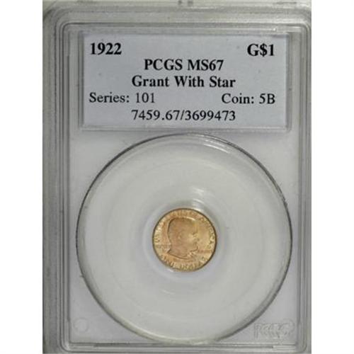 <B>1922 G$1 Grant with Star MS67 PCGS.</B></I> A frosty light yellow-gold example, this Superb Gem exhibits wonderful rose toning on both sides. The surfaces are pristine and the designs are bold. Although relatively common, even at the Superb Gem level, PCGS has only certified one higher grade coin (1/08).<BR><BR><b>Shipping:</b> Coins & Currency (<a target="_blank" href="http://www.heritageauctions.com/common/shipping.php">view shipping information</a>)
