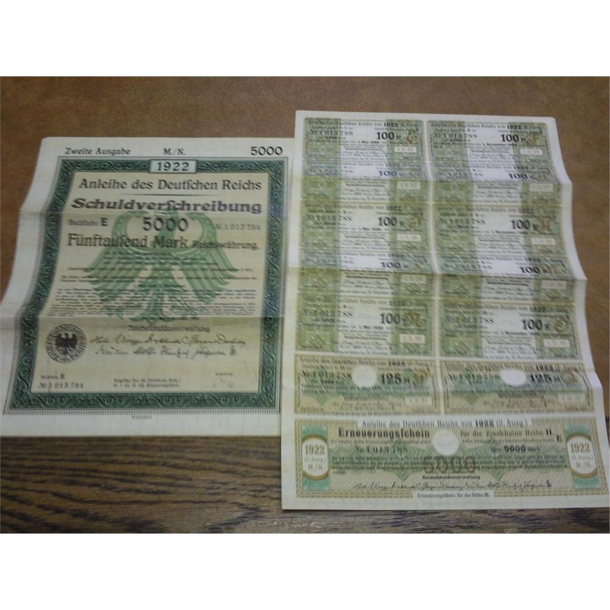 1922 GERMAN 5000 MARK BOND WITH COUPONS COMPLETE