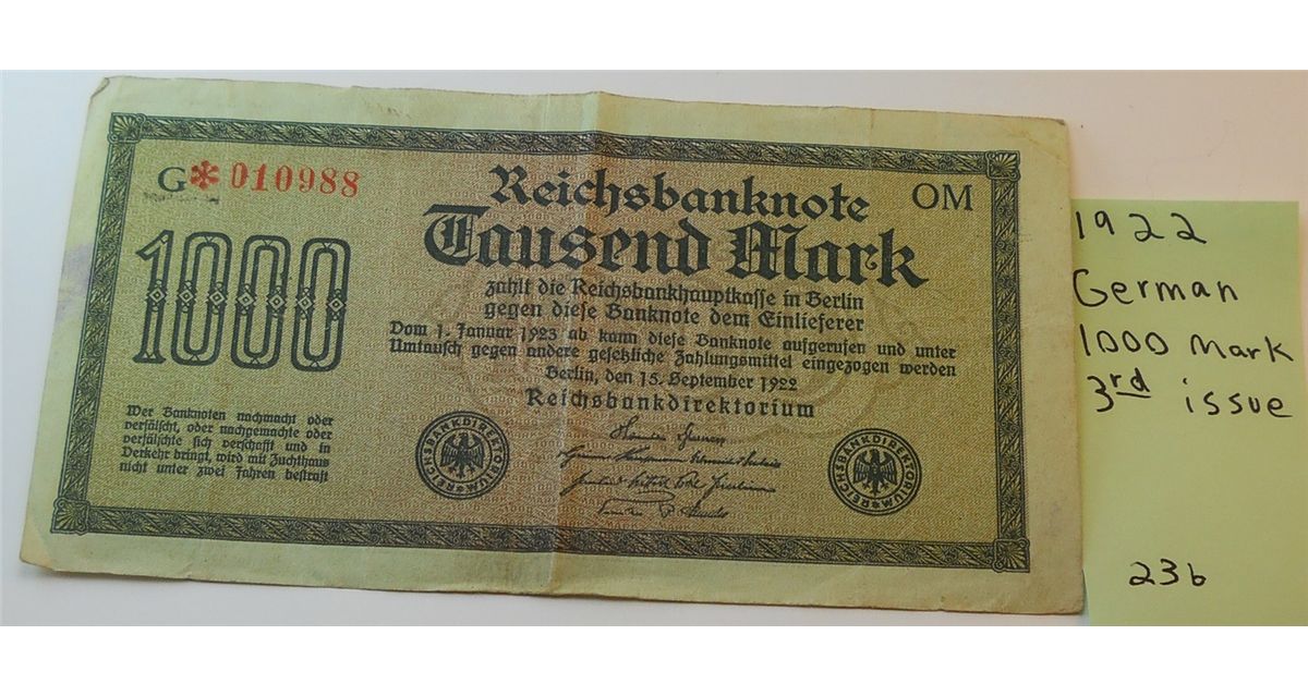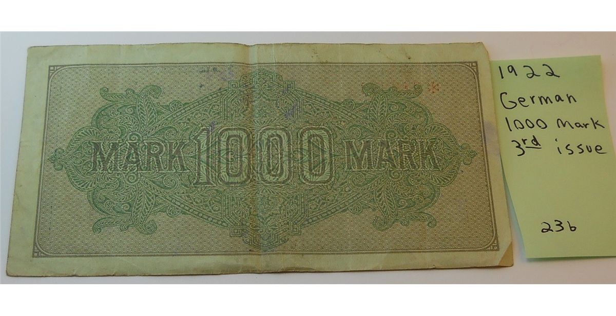 1922 German Mark- 1000- **3rd Issue** Beautiful Condition! ***Coin, Currency & All Items Listed in this auction - Grades, Conditions and Values are not Safe Deposit Coins LLC Responsibilty. Grades, Condition and Values are determined by Consigner(s) & Buyers ONLY***