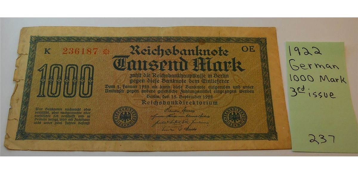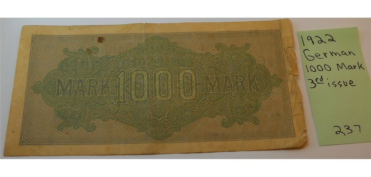 1922 German Mark- 1000- **3rd Issue** Beautiful Condition! ***Coin, Currency & All Items Listed in this auction - Grades, Conditions and Values are not Safe Deposit Coins LLC Responsibilty. Grades, Condition and Values are determined by Consigner(s) & Buyers ONLY***