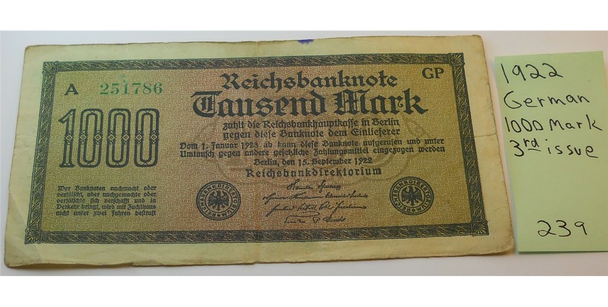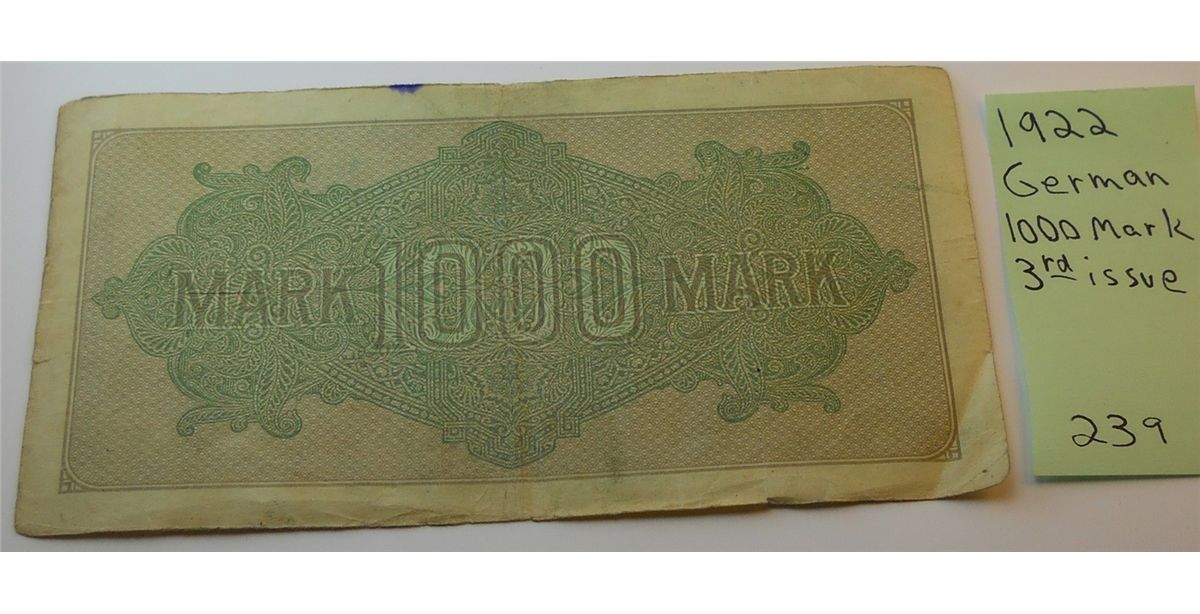 1922 German Mark- 1000- **3rd Issue** Beautiful Condition! ***Coin, Currency & All Items Listed in this auction - Grades, Conditions and Values are not Safe Deposit Coins LLC Responsibilty. Grades, Condition and Values are determined by Consigner(s) & Buyers ONLY***