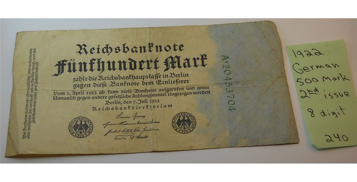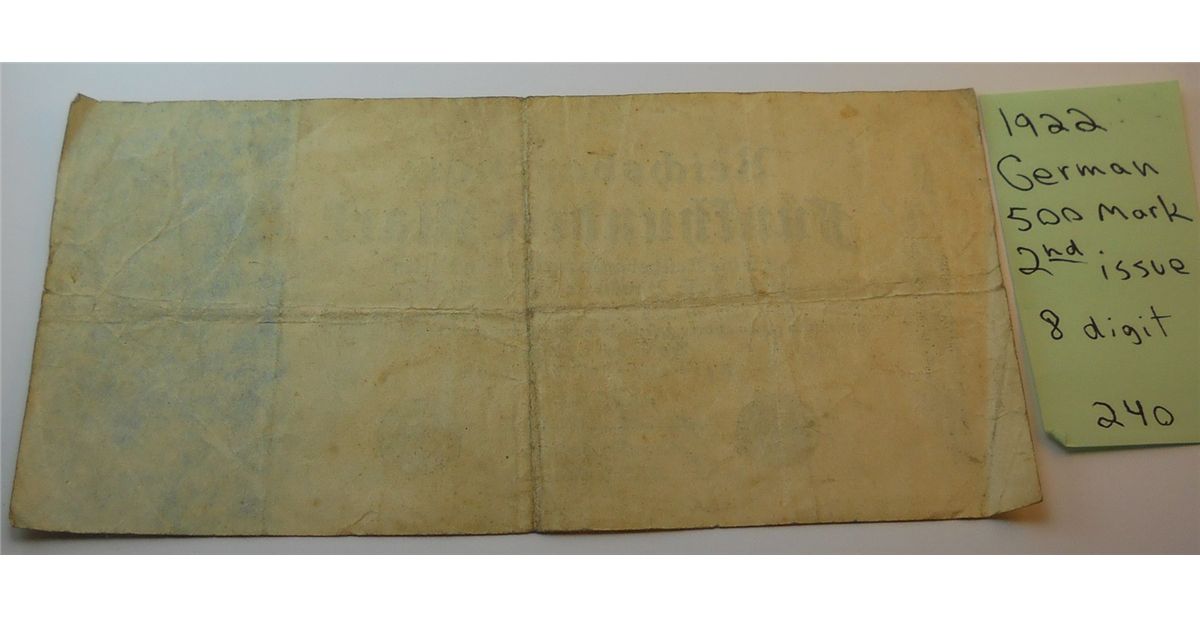 1922 German Mark- 500- ***2nd Issue 8 digit*** very nice condition! ***Coin, Currency & All Items Listed in this auction - Grades, Conditions and Values are not Safe Deposit Coins LLC Responsibilty. Grades, Condition and Values are determined by Consigner(s) & Buyers ONLY***