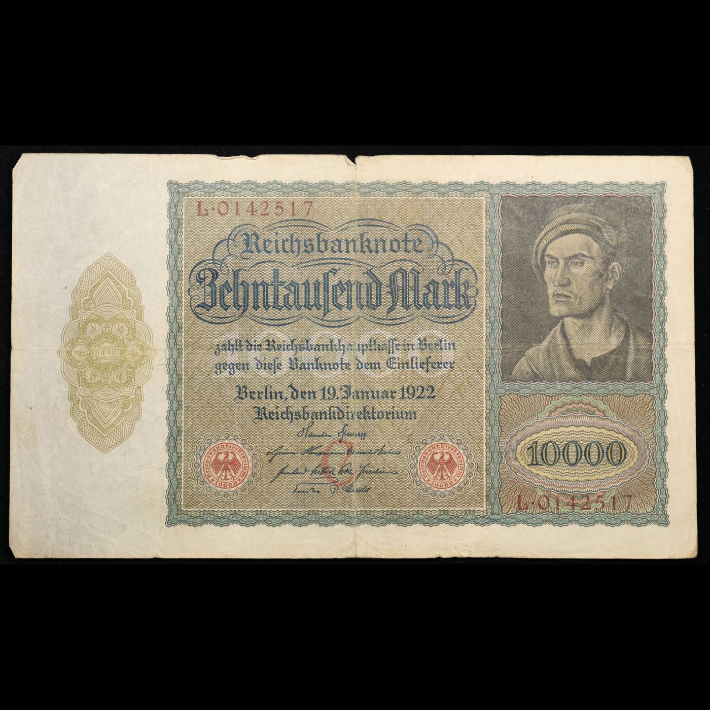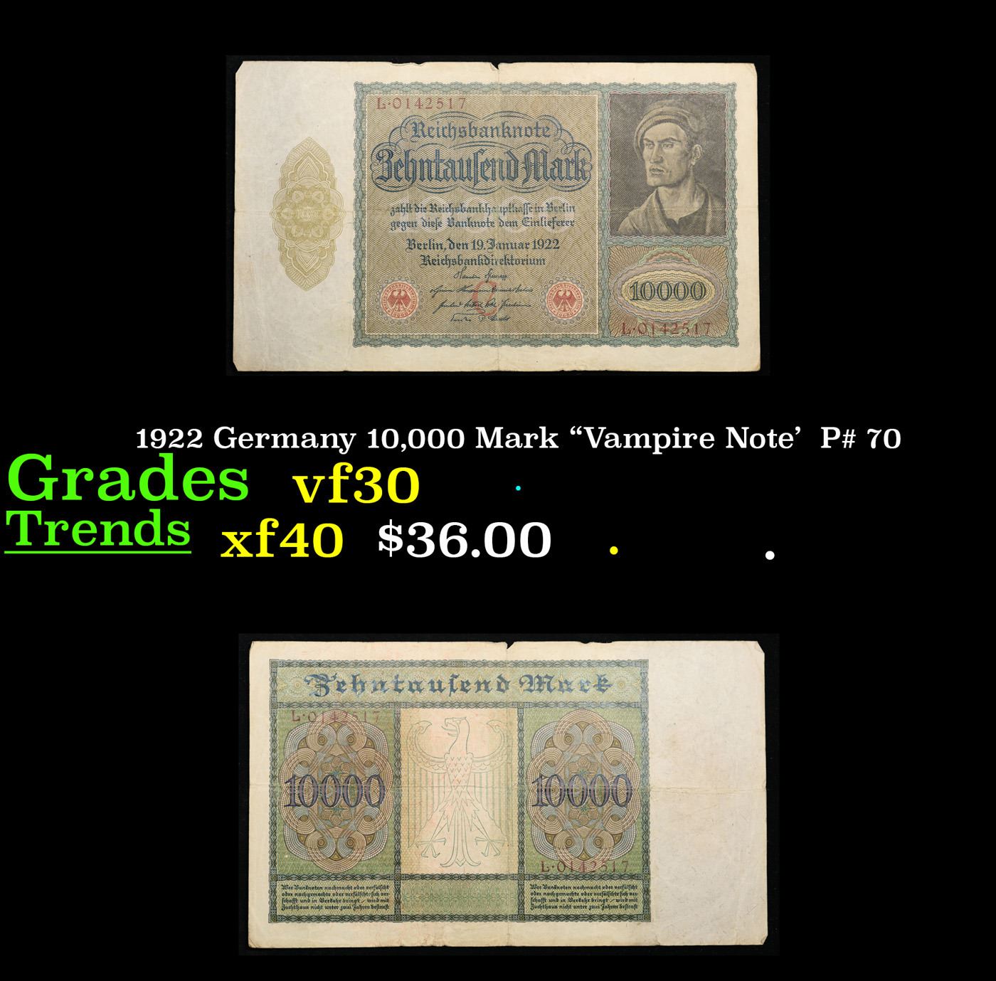 1922 Germany 10,000 Mark "Vampire Note' P# 70 Grades vf++. Among the many bills issued during the hyperinflation crisis in the post-WWI German Weimar Republic, the "Vampire Note" is a particular standout. It is known as the Vampire Note because when the note's engraver (identity unknown) adapted a portrait by famous German Renaissance painter Albrecht Durer for the note, he made an odd alteration where the neck of the figure looks like a Vampire when the bill is rotated 90 degrees. It takes some imagination to see, but was intentional and meant to represent the anti-French sentiment in WWI Germany -- France was considered to be "sucking the life out of" the country following the signing of the Treaty of Versailles. The Reichsbank noticed this alteration, but did not change it, printing several varieties of the bill with the design and giving credence to the popular anti-French sentiment. There are three varieties, Pick # 70 and 71 differing in the reverse design, and Pick # 72 being a smaller version of Pick # 71.