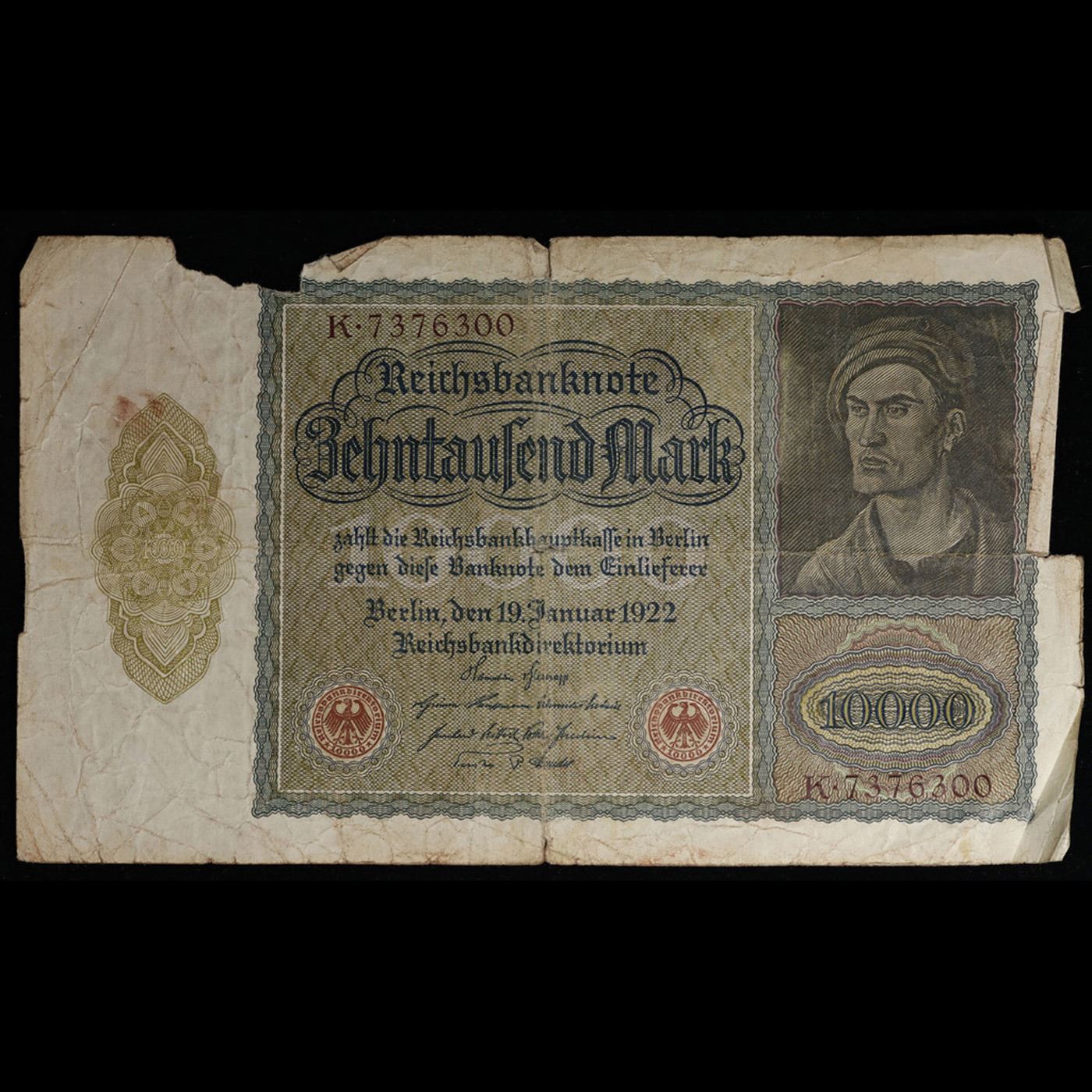 1922 Germany 10,000 Mark Vampire Note P# 71 Grades vf details. The front design of the three notes featured work by the German painter Albrecht Durer, called “Portrait of a Young Man.” Durer is one of Germany's most famous Renaissance artists, and this piece was done during that time.When this note printed, the engraver, whose identity is unknown, made an unusual alteration. If you turn the note to the left at a 90-degree angle, you can see what looks like a face and an open mouth on the man’s neck (as pictured in the image above). This would become known as the “Vampire Note.”It does take a few long seconds and a bit of imagination to see the vampire. You could also say he has a black hood over his head, which is the man’s shirt.This was supposed to represent the anti-French sentiment in Germany after World War I by giving the impression that he is sucking the life out of Germany. The Treaty of Versailles, which held Germany responsible for the war, was signed in France. The Reichsbank did notice this alteration but did not stop printing of the note for correction. They kept printing more notes, thus further emphasizing their disdain for France.