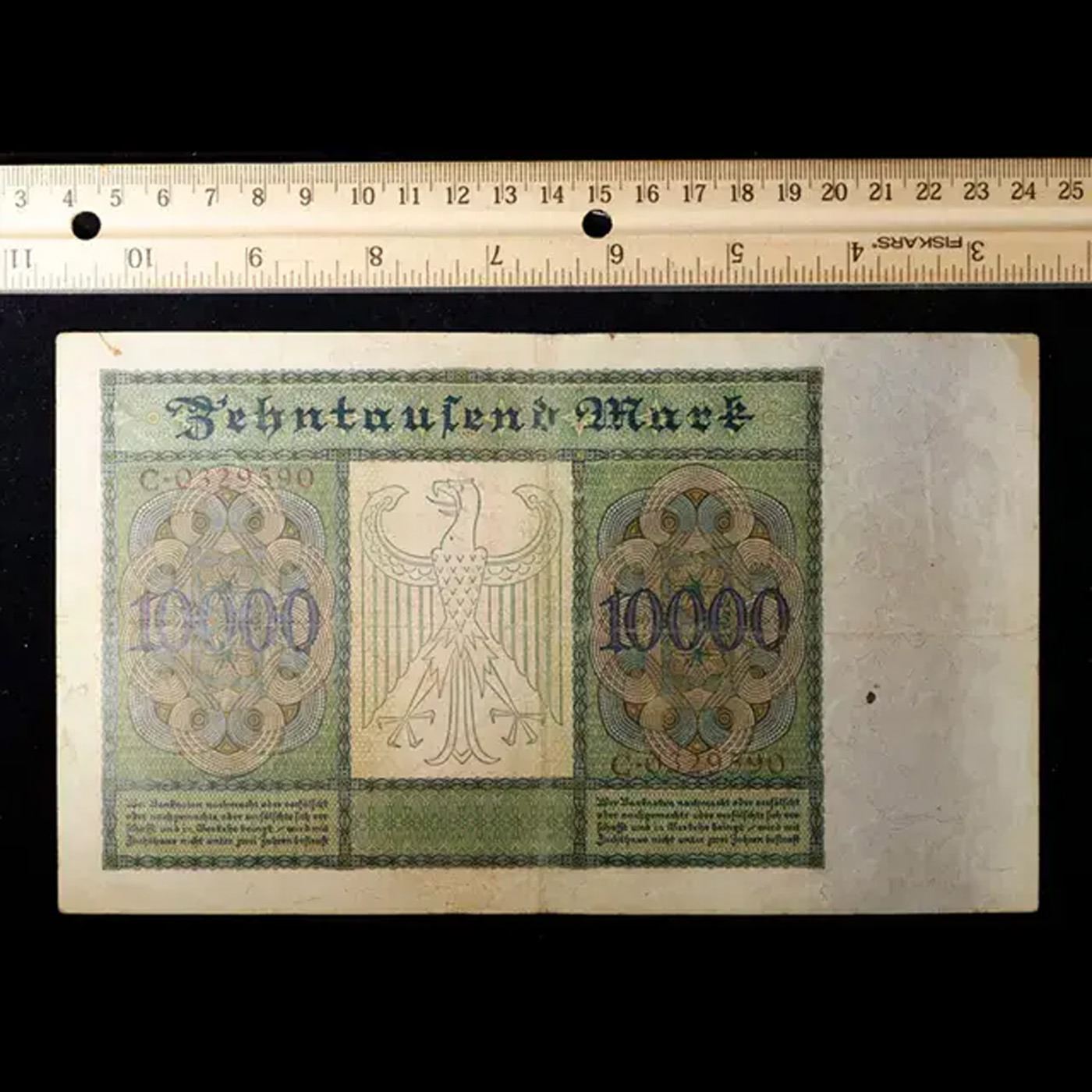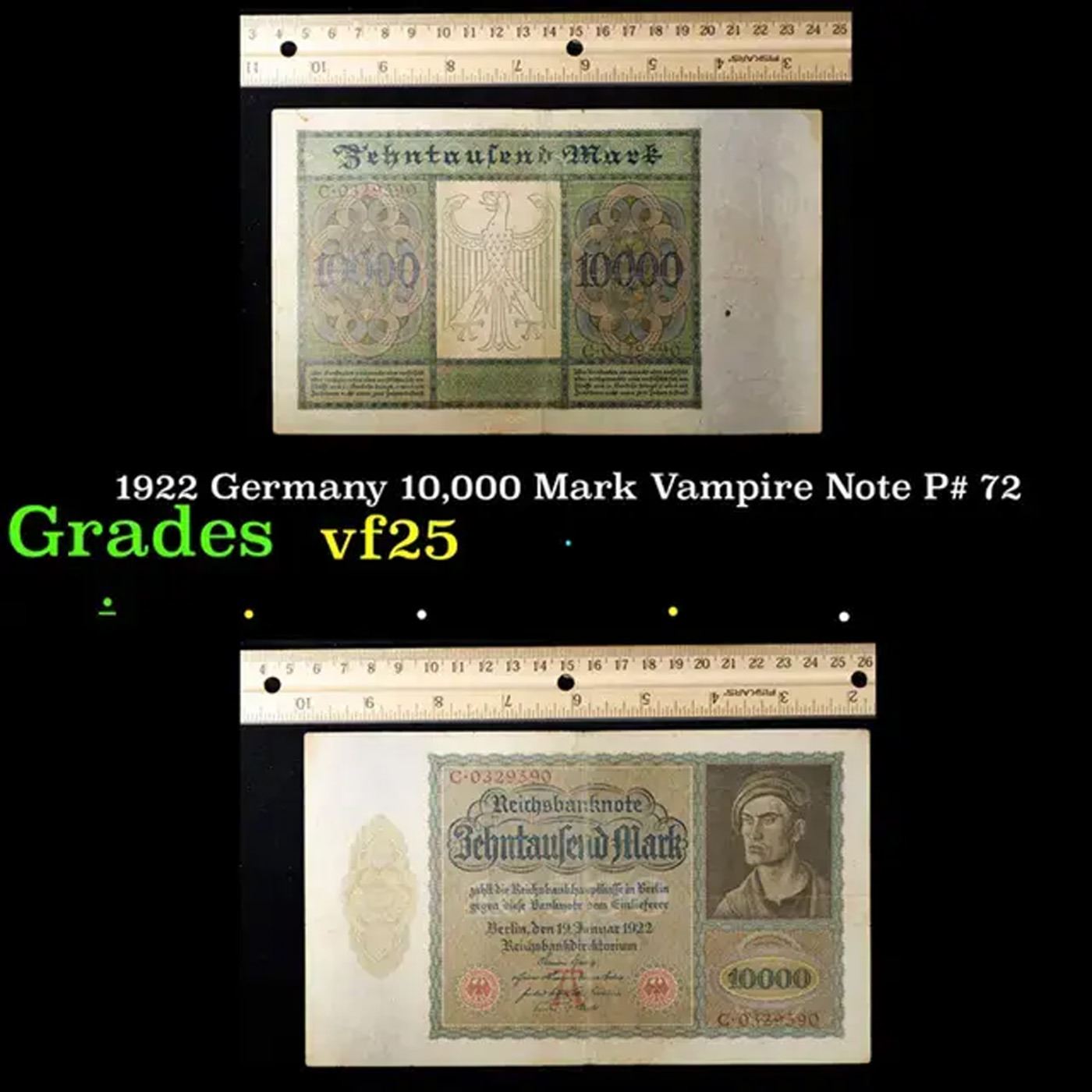 1922 Germany 10,000 Mark Vampire Note P# 72 Grades vf+. Among the many bills issued during the hyperinflation crisis in the post-WWI German Weimar Republic, the "Vampire Note" is a particular standout. It is known as the Vampire Note because when the note's engraver (identity unknown) adapted a portrait by famous German Renaissance painter Albrecht Durer for the note, he made an odd alteration where the neck of the figure looks like a Vampire when the bill is rotated 90 degrees. It takes some imagination to see, but was intentional and meant to represent the anti-French sentiment in WWI Germany -- France was considered to be "sucking the life out of" the country following the signing of the Treaty of Versailles. The Reichsbank noticed this alteration, but did not change it, printing several varieties of the bill with the design and giving credence to the popular anti-French sentiment. There are three varieties, Pick # 70 and 71 differing in the reverse design, and Pick # 72 being a smaller version of Pick # 71.
