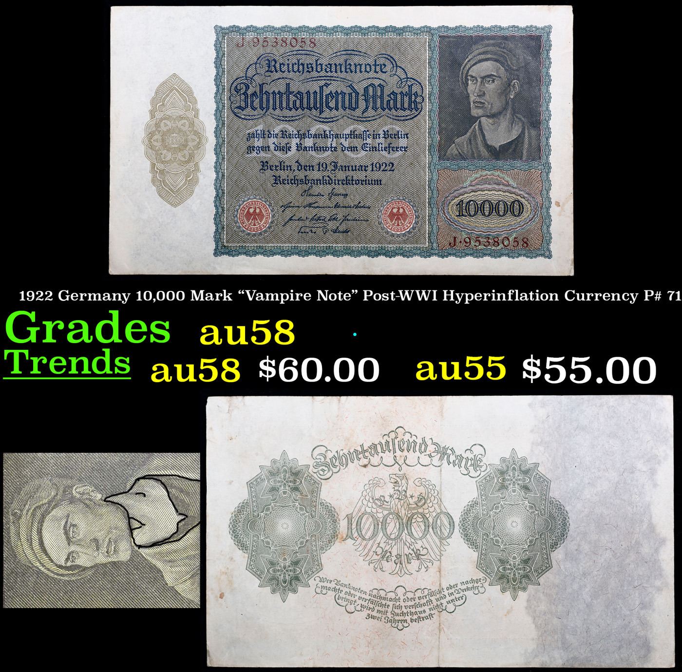 1922 Germany 10,000 Mark "Vampire Note" Post-WWI Hyperinflation Currency P# 71 Grades Choice AU/BU Slider. Among the many bills issued during the hyperinflation crisis in the post-WWI German Weimar Republic, the "Vampire Note" is a particular standout. It is known as the Vampire Note because when the note's engraver (identity unknown) adapted a portrait by famous German Renaissance painter Albrecht Durer for the note, he made an odd alteration where the neck of the figure looks like a Vampire when the bill is rotated 90 degrees. It takes some imagination to see, but was intentional and meant to represent the anti-French sentiment in WWI Germany -- France was considered to be "sucking the life out of" the country following the signing of the Treaty of Versailles. The Reichsbank noticed this alteration, but did not change it, printing several varieties of the bill with the design and giving credence to the popular anti-French sentiment. There are three varieties, Pick # 70 and 71 differing in the reverse design, and Pick # 72 being a smaller version of Pick # 71.