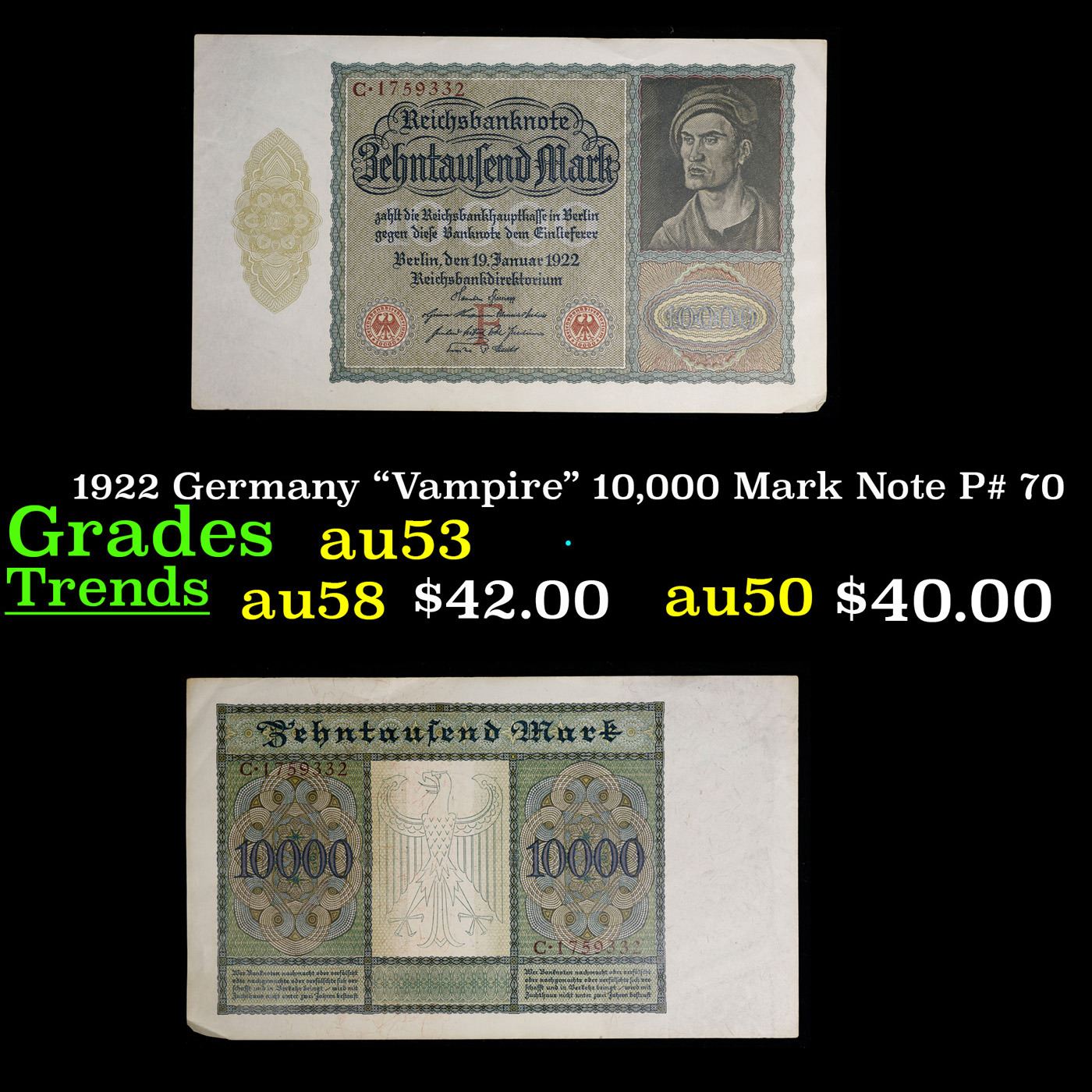 1922 Germany "Vampire" 10,000 Mark Note P# 70 Grades Select AU. Among the many bills issued during the hyperinflation crisis in the post-WWI German Weimar Republic, the "Vampire Note" is a particular standout. It is known as the Vampire Note because when the note's engraver (identity unknown) adapted a portrait by famous German Renaissance painter Albrecht Durer for the note, he made an odd alteration where the neck of the figure looks like a Vampire when the bill is rotated 90 degrees. It takes some imagination to see, but was intentional and meant to represent the anti-French sentiment in WWI Germany -- France was considered to be "sucking the life out of" the country following the signing of the Treaty of Versailles. The Reichsbank noticed this alteration, but did not change it, printing several varieties of the bill with the design and giving credence to the popular anti-French sentiment. There are three varieties, Pick # 70 and 71 differing in the reverse design, and Pick # 72 being a smaller version of Pick # 71.