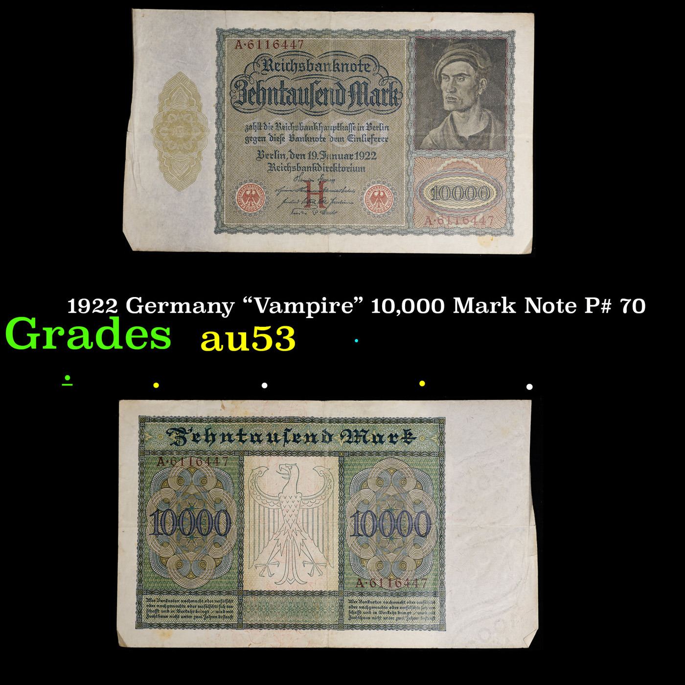 1922 Germany "Vampire" 10,000 Mark Note P# 70 Grades Select AU. Among the many bills issued during the hyperinflation crisis in the post-WWI German Weimar Republic, the "Vampire Note" is a particular standout. It is known as the Vampire Note because when the note's engraver (identity unknown) adapted a portrait by famous German Renaissance painter Albrecht Durer for the note, he made an odd alteration where the neck of the figure looks like a Vampire when the bill is rotated 90 degrees. It takes some imagination to see, but was intentional and meant to represent the anti-French sentiment in WWI Germany -- France was considered to be "sucking the life out of" the country following the signing of the Treaty of Versailles. The Reichsbank noticed this alteration, but did not change it, printing several varieties of the bill with the design and giving credence to the popular anti-French sentiment. There are three varieties, Pick # 70 and 71 differing in the reverse design, and Pick # 72 being a smaller version of Pick # 71.