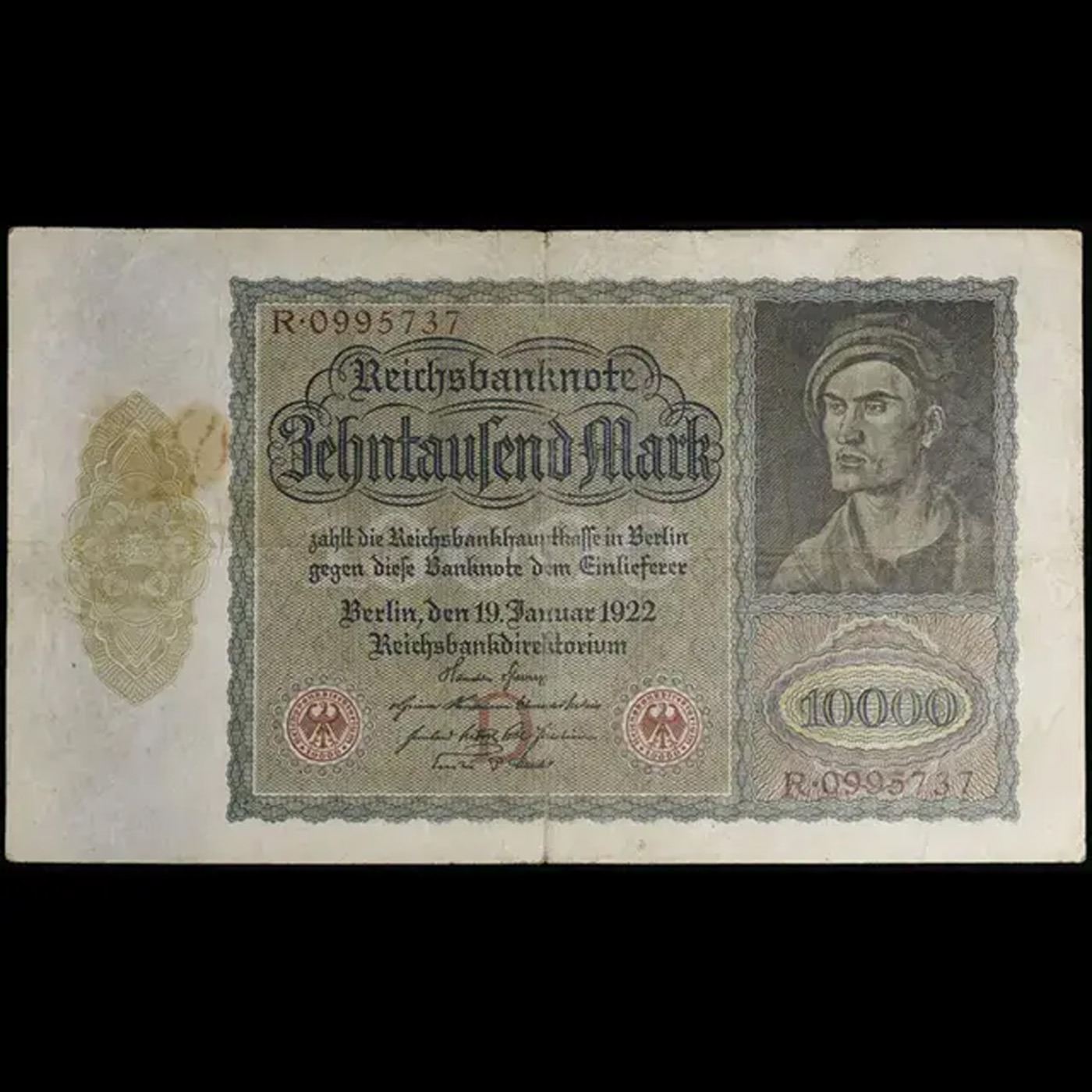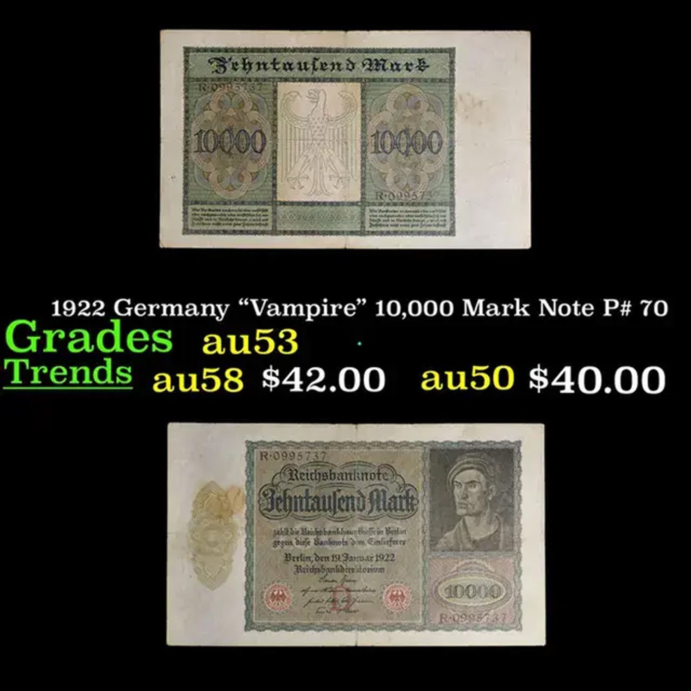 1922 Germany "Vampire" 10,000 Mark Note P# 70 Grades Select AU. Among the many bills issued during the hyperinflation crisis in the post-WWI German Weimar Republic, the "Vampire Note" is a particular standout. It is known as the Vampire Note because when the note's engraver (identity unknown) adapted a portrait by famous German Renaissance painter Albrecht Durer for the note, he made an odd alteration where the neck of the figure looks like a Vampire when the bill is rotated 90 degrees. It takes some imagination to see, but was intentional and meant to represent the anti-French sentiment in WWI Germany -- France was considered to be "sucking the life out of" the country following the signing of the Treaty of Versailles. The Reichsbank noticed this alteration, but did not change it, printing several varieties of the bill with the design and giving credence to the popular anti-French sentiment. There are three varieties, Pick # 70 and 71 differing in the reverse design, and Pick # 72 being a smaller version of Pick # 71.