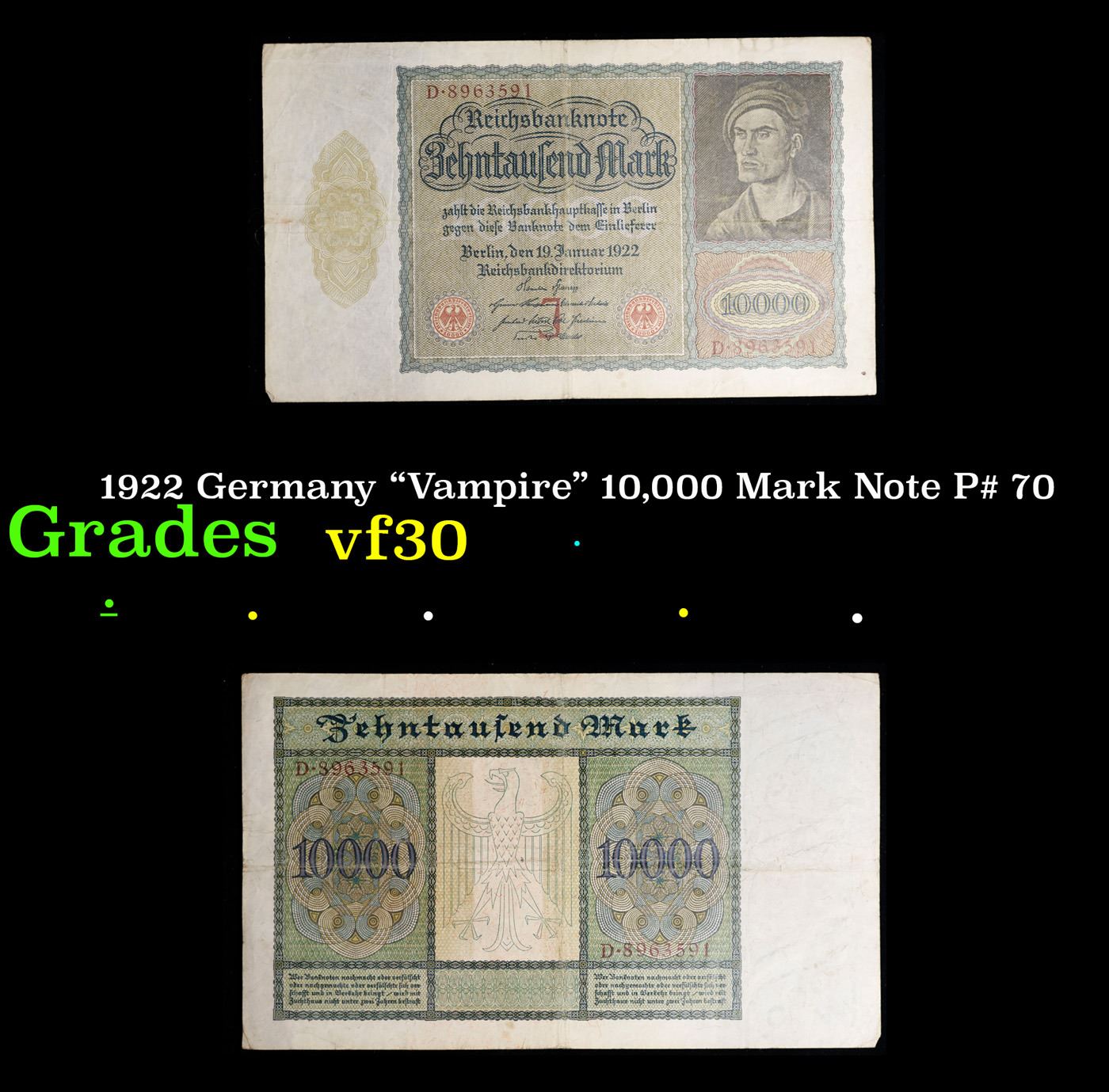 1922 Germany "Vampire" 10,000 Mark Note P# 70 Grades vf++. Among the many bills issued during the hyperinflation crisis in the post-WWI German Weimar Republic, the "Vampire Note" is a particular standout. It is known as the Vampire Note because when the note's engraver (identity unknown) adapted a portrait by famous German Renaissance painter Albrecht Durer for the note, he made an odd alteration where the neck of the figure looks like a Vampire when the bill is rotated 90 degrees. It takes some imagination to see, but was intentional and meant to represent the anti-French sentiment in WWI Germany -- France was considered to be "sucking the life out of" the country following the signing of the Treaty of Versailles. The Reichsbank noticed this alteration, but did not change it, printing several varieties of the bill with the design and giving credence to the popular anti-French sentiment. There are three varieties, Pick # 70 and 71 differing in the reverse design, and Pick # 72 being a smaller version of Pick # 71.