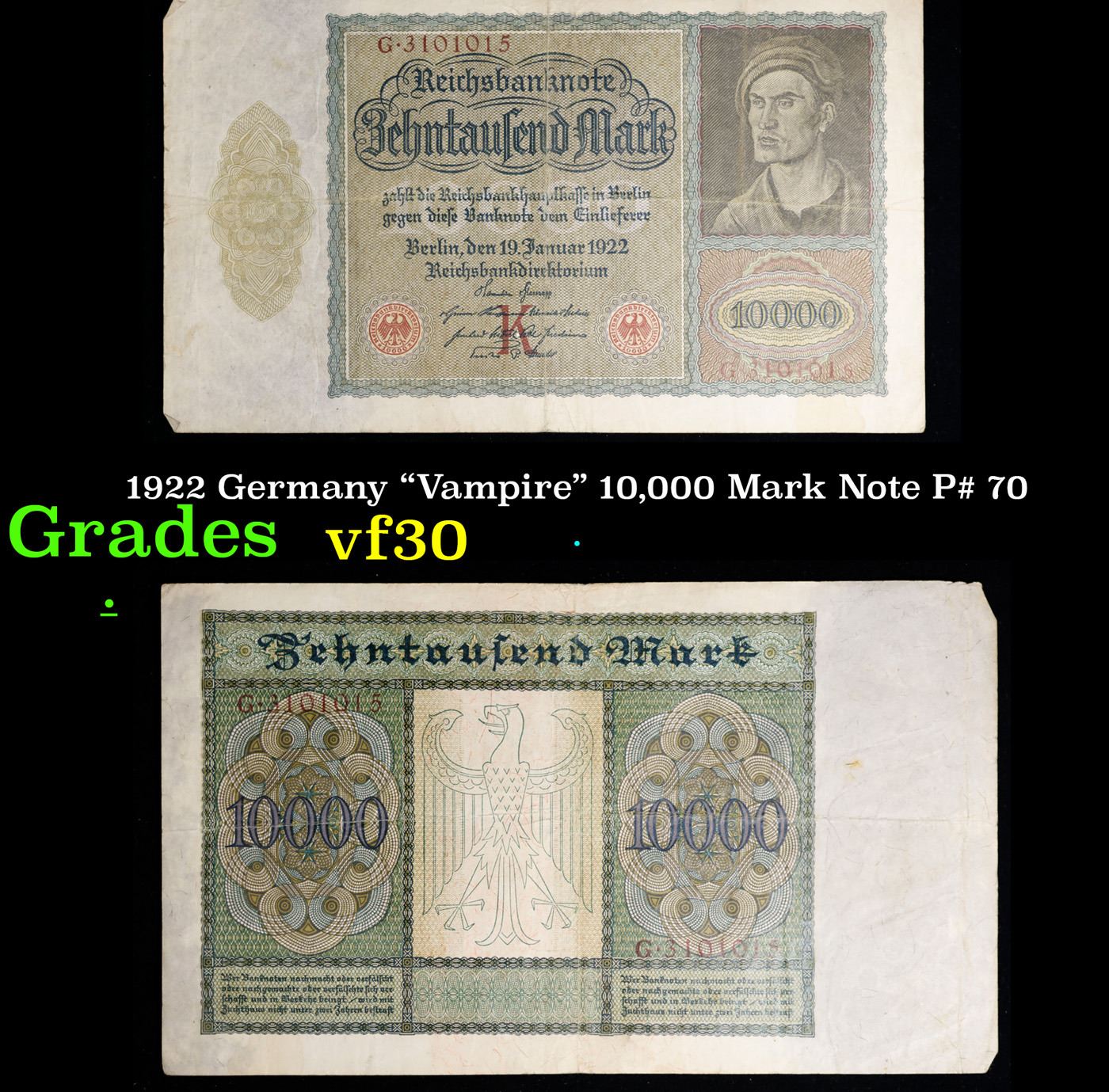 1922 Germany "Vampire" 10,000 Mark Note P# 70 Grades vf++. Among the many bills issued during the hyperinflation crisis in the post-WWI German Weimar Republic, the "Vampire Note" is a particular standout. It is known as the Vampire Note because when the note's engraver (identity unknown) adapted a portrait by famous German Renaissance painter Albrecht Durer for the note, he made an odd alteration where the neck of the figure looks like a Vampire when the bill is rotated 90 degrees. It takes some imagination to see, but was intentional and meant to represent the anti-French sentiment in WWI Germany -- France was considered to be "sucking the life out of" the country following the signing of the Treaty of Versailles. The Reichsbank noticed this alteration, but did not change it, printing several varieties of the bill with the design and giving credence to the popular anti-French sentiment. There are three varieties, Pick # 70 and 71 differing in the reverse design, and Pick # 72 being a smaller version of Pick # 71.