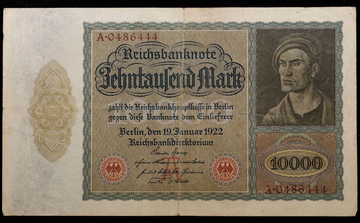 1922 Germany "Vampire" 10,000 Marks Post-WWI Hyperinflation Banknote P# 70 Grades vf++. Among the many bills issued during the hyperinflation crisis in the post-WWI German Weimar Republic, the "Vampire Note" is a particular standout. It is known as the Vampire Note because when the note's engraver (identity unknown) adapted a portrait by famous German Renaissance painter Albrecht Durer for the note, he made an odd alteration where the neck of the figure looks like a Vampire when the bill is rotated 90 degrees. It takes some imagination to see, but was intentional and meant to represent the anti-French sentiment in WWI Germany -- France was considered to be "sucking the life out of" the country following the signing of the Treaty of Versailles. The Reichsbank noticed this alteration, but did not change it, printing several varieties of the bill with the design and giving credence to the popular anti-French sentiment. There are three varieties, Pick # 70 and 71 differing in the reverse design, and Pick # 72 being a smaller version of Pick # 71.