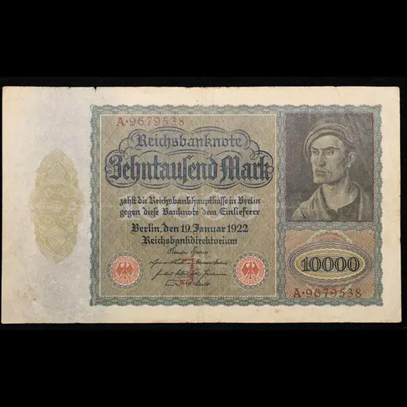 1922 Germany "Vampire" 10,000 Marks Post-WWI Hyperinflation Banknote P# 70 Grades vf++. Among the many bills issued during the hyperinflation crisis in the post-WWI German Weimar Republic, the "Vampire Note" is a particular standout. It is known as the Vampire Note because when the note's engraver (identity unknown) adapted a portrait by famous German Renaissance painter Albrecht Durer for the note, he made an odd alteration where the neck of the figure looks like a Vampire when the bill is rotated 90 degrees. It takes some imagination to see, but was intentional and meant to represent the anti-French sentiment in WWI Germany -- France was considered to be "sucking the life out of" the country following the signing of the Treaty of Versailles. The Reichsbank noticed this alteration, but did not change it, printing several varieties of the bill with the design and giving credence to the popular anti-French sentiment. There are three varieties, Pick # 70 and 71 differing in the reverse design, and Pick # 72 being a smaller version of Pick # 71.