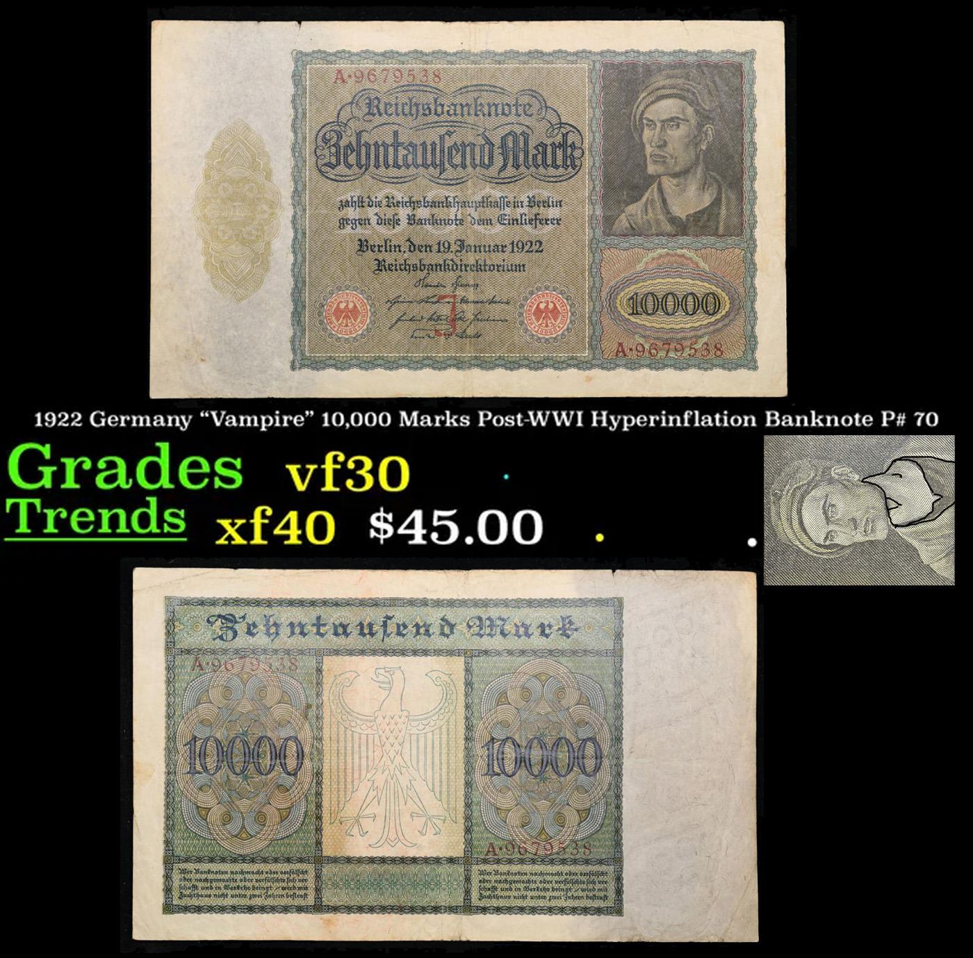 1922 Germany "Vampire" 10,000 Marks Post-WWI Hyperinflation Banknote P# 70 Grades vf++.        Among the many bills issued during the hyperinflation crisis in the post-WWI German Weimar Republic, the "Vampire Note" is a particular standout. It is known as the Vampire Note because when the note's engraver (identity unknown) adapted a portrait by famous German Renaissance painter Albrecht Durer for the note, he made an odd alteration where the neck of the figure looks like a Vampire when the bill is rotated 90 degrees. It takes some imagination to see, but was intentional and meant to represent the anti-French sentiment in WWI Germany -- France was considered to be "sucking the life out of" the country following the signing of the Treaty of Versailles. The Reichsbank noticed this alteration, but did not change it, printing several varieties of the bill with the design and giving credence to the popular anti-French sentiment. There are three varieties, Pick # 70 and 71 differing in the reverse design, and Pick # 72 being a smaller version of Pick # 71.