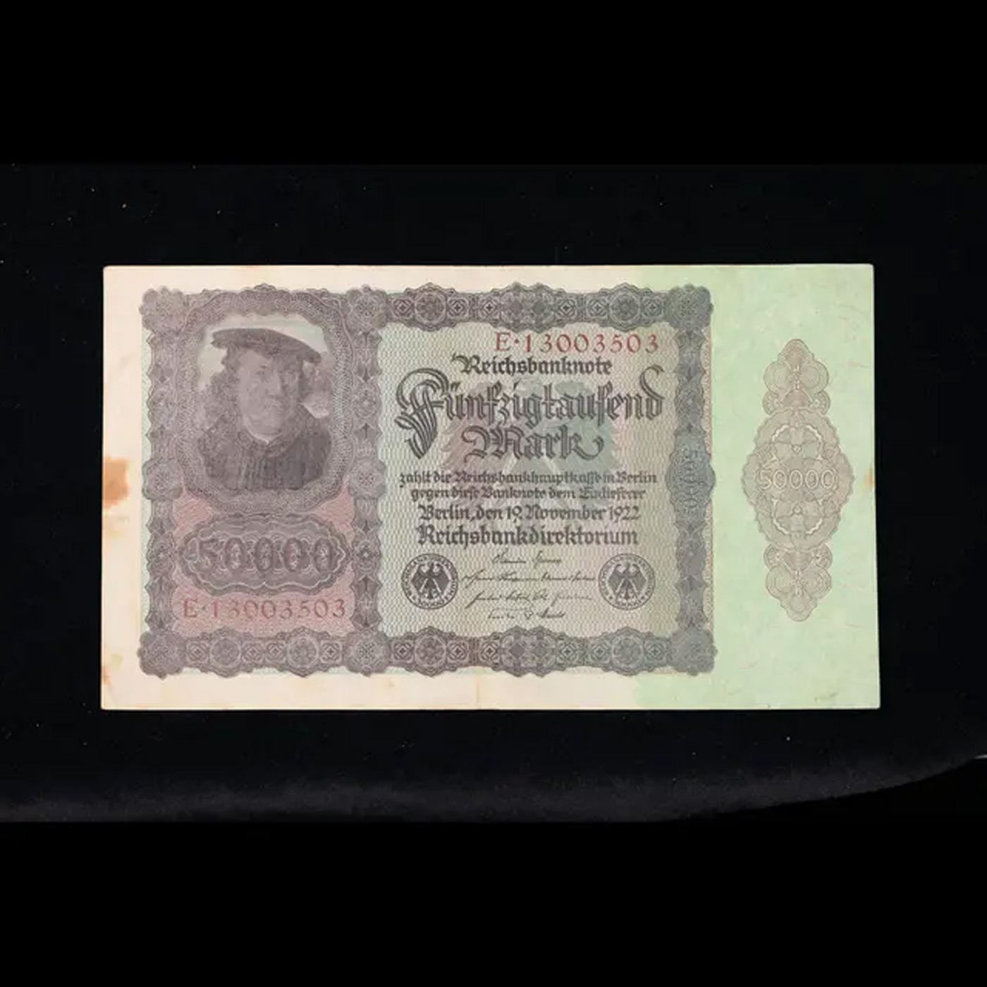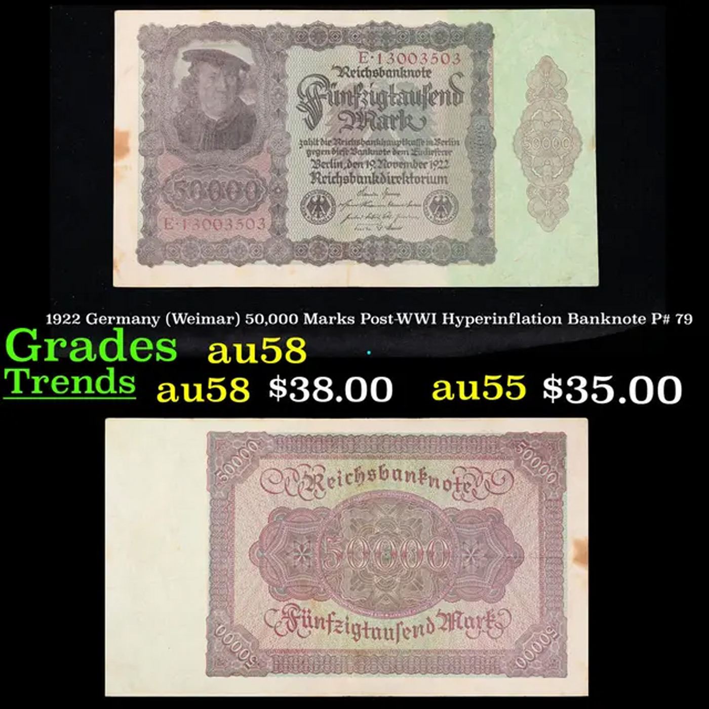 1922 Germany (Weimar) 50,000 Marks Post-WWI Hyperinflation Banknote P# 79 Grades Choice AU/BU Slider. In the early 1920s, post-WWI Germany saw its economy spiraling out of control. Hyperinflation started directly after the war in 1918, but truly took over the Weimar Republic from 1921 to 1923. The value of the Mark declined incredibly rapidly. 1 USD was equal to 50 German Marks at the beginning of 1920. Toward the end of 1923, 1 USD was equal to over 4,200,000,000,000 German Marks. At times, denominations of the Mark became less valuable than the paper and labor to print it almost immediately after printing. Thus, denominations of the Mark notes became incredibly large, ending up in the tens of trillions.