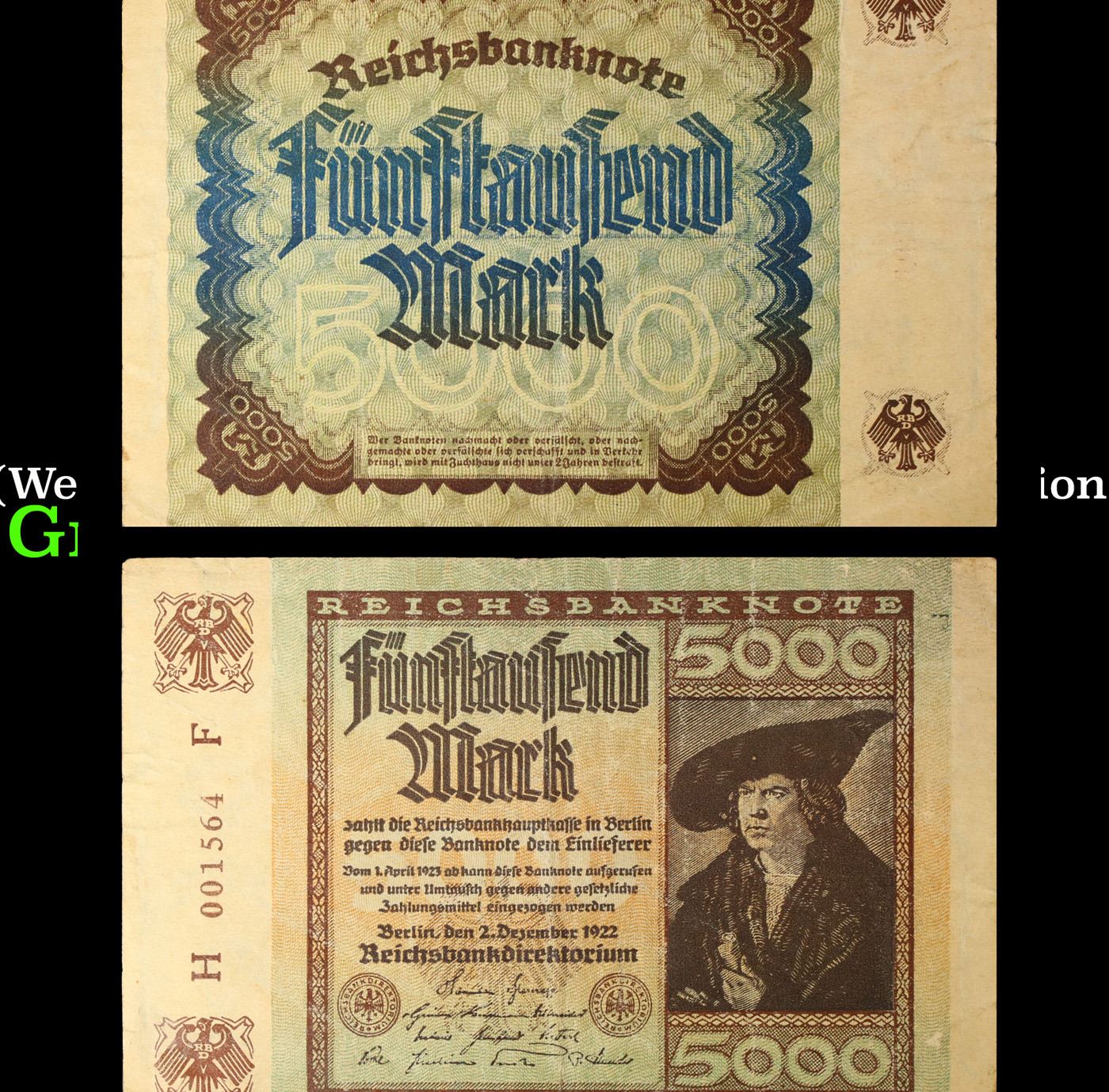 1922 Germany (Weimar) 5000 Marks Post-WWI Hyperinflation Banknote P# 81a Grades Choice AU/BU Slider