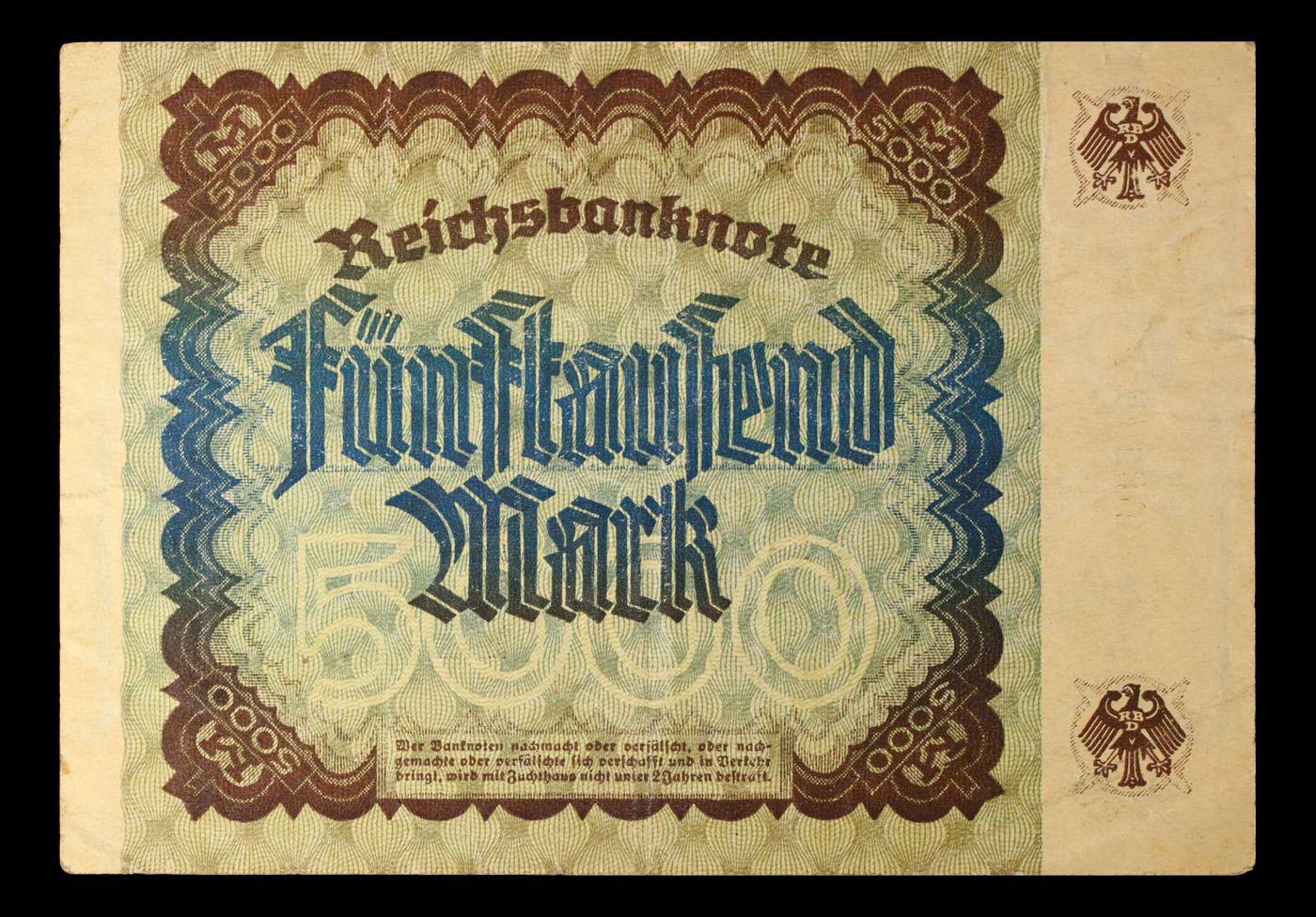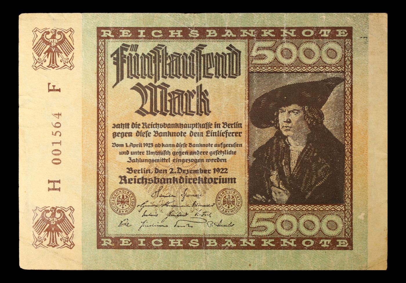 1922 Germany (Weimar) 5000 Marks Post-WWI Hyperinflation Banknote P# 81a Grades Choice AU/BU Slider. In the early 1920s, post-WWI Germany saw its economy spiraling out of control. Hyperinflation started directly after the war in 1918, but truly took over the Weimar Republic from 1921 to 1923. The value of the Mark declined incredibly rapidly. 1 USD was equal to 50 German Marks at the beginning of 1920. Toward the end of 1923, 1 USD was equal to over 4,200,000,000,000 German Marks. At times, denominations of the Mark became less valuable than the paper and labor to print it almost immediately after printing. Thus, denominations of the Mark notes became incredibly large, ending up in the tens of trillions.