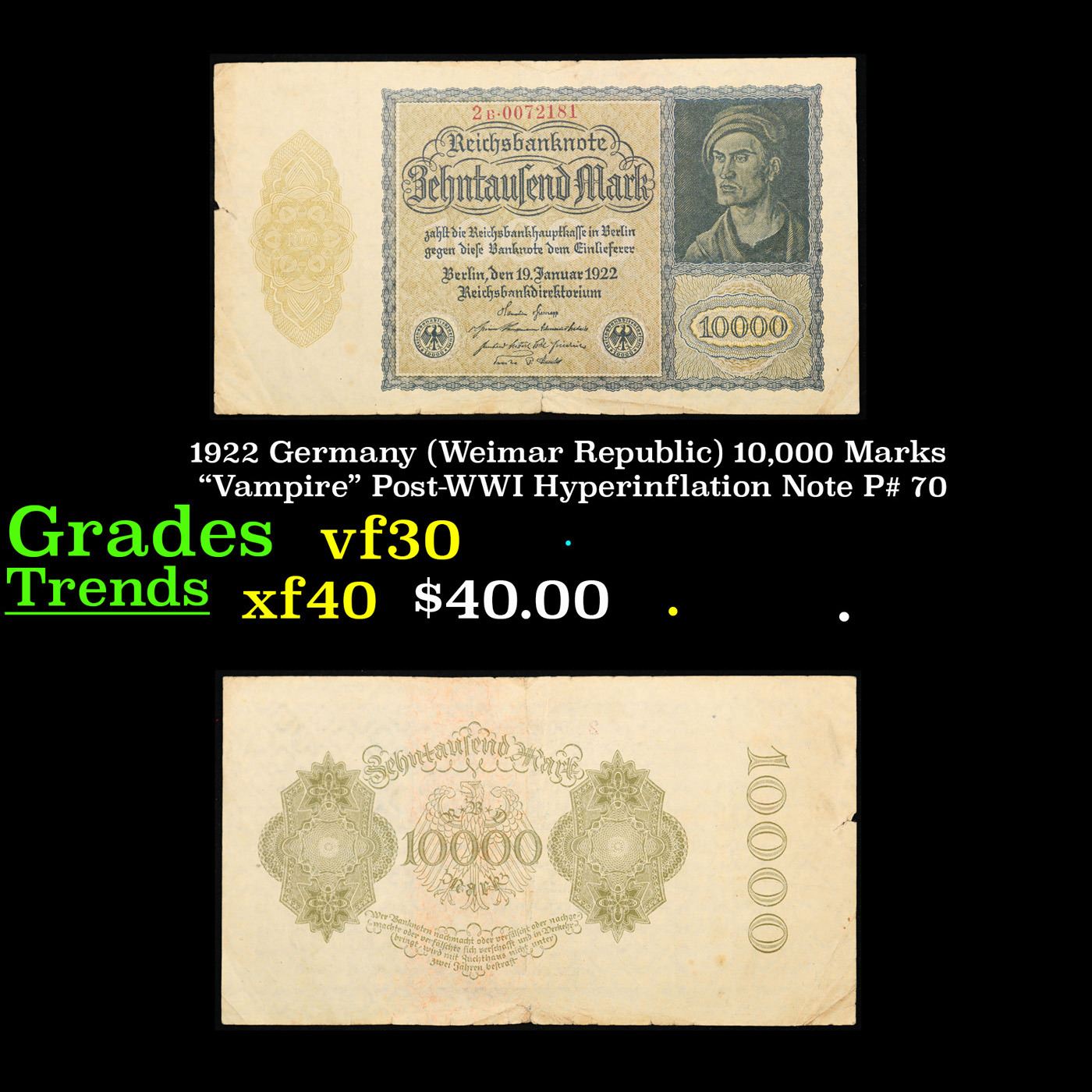 1922 Germany (Weimar Republic) 10,000 Marks "Vampire" Post-WWI Hyperinflation Note P# 70 Grades vf++. Among the many bills issued during the hyperinflation crisis in the post-WWI German Weimar Republic, the "Vampire Note" is a particular standout. It is known as the Vampire Note because when the note's engraver (identity unknown) adapted a portrait by famous German Renaissance painter Albrecht Durer for the note, he made an odd alteration where the neck of the figure looks like a Vampire when the bill is rotated 90 degrees. It takes some imagination to see, but was intentional and meant to represent the anti-French sentiment in WWI Germany -- France was considered to be "sucking the life out of" the country following the signing of the Treaty of Versailles. The Reichsbank noticed this alteration, but did not change it, printing several varieties of the bill with the design and giving credence to the popular anti-French sentiment. There are three varieties, Pick # 70 and 71 differing in the reverse design, and Pick # 72 being a smaller version of Pick # 71.