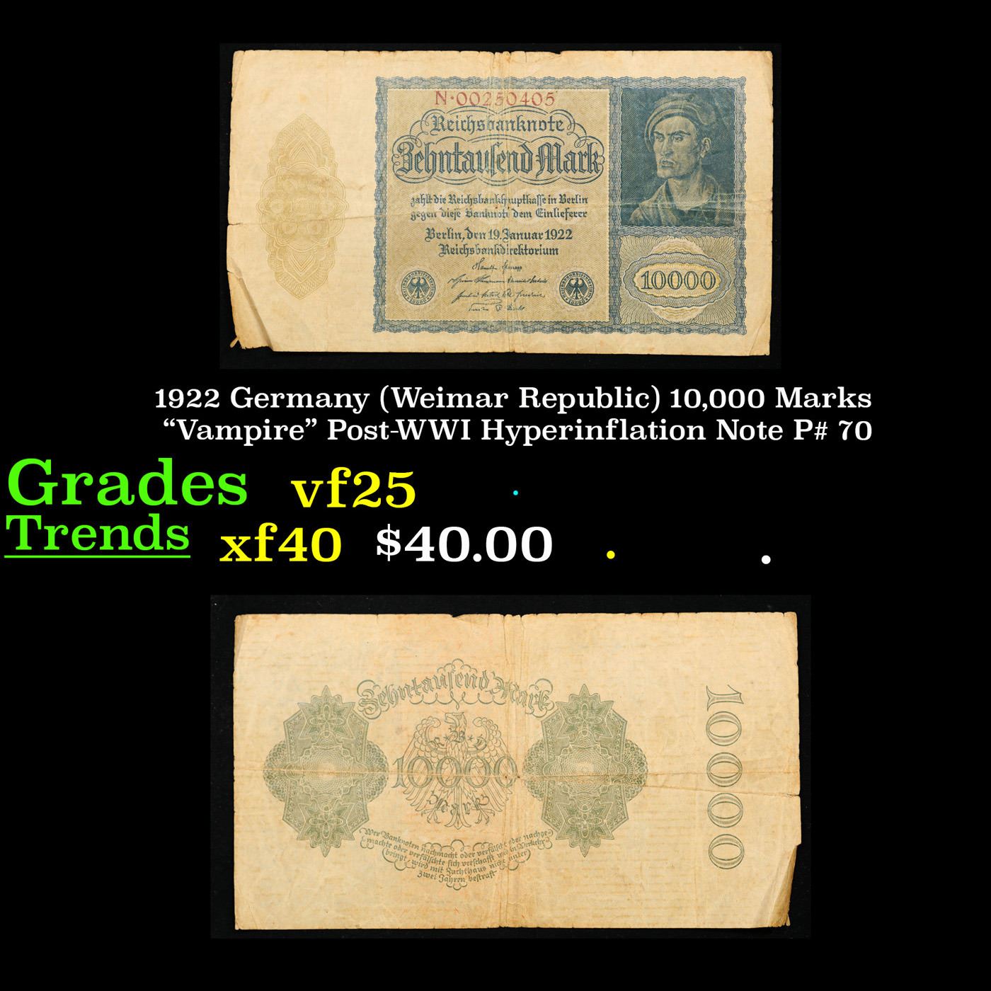 1922 Germany (Weimar Republic) 10,000 Marks "Vampire" Post-WWI Hyperinflation Note P# 70 Grades vf+. Among the many bills issued during the hyperinflation crisis in the post-WWI German Weimar Republic, the "Vampire Note" is a particular standout. It is known as the Vampire Note because when the note's engraver (identity unknown) adapted a portrait by famous German Renaissance painter Albrecht Durer for the note, he made an odd alteration where the neck of the figure looks like a Vampire when the bill is rotated 90 degrees. It takes some imagination to see, but was intentional and meant to represent the anti-French sentiment in WWI Germany -- France was considered to be "sucking the life out of" the country following the signing of the Treaty of Versailles. The Reichsbank noticed this alteration, but did not change it, printing several varieties of the bill with the design and giving credence to the popular anti-French sentiment. There are three varieties, Pick # 70 and 71 differing in the reverse design, and Pick # 72 being a smaller version of Pick # 71.