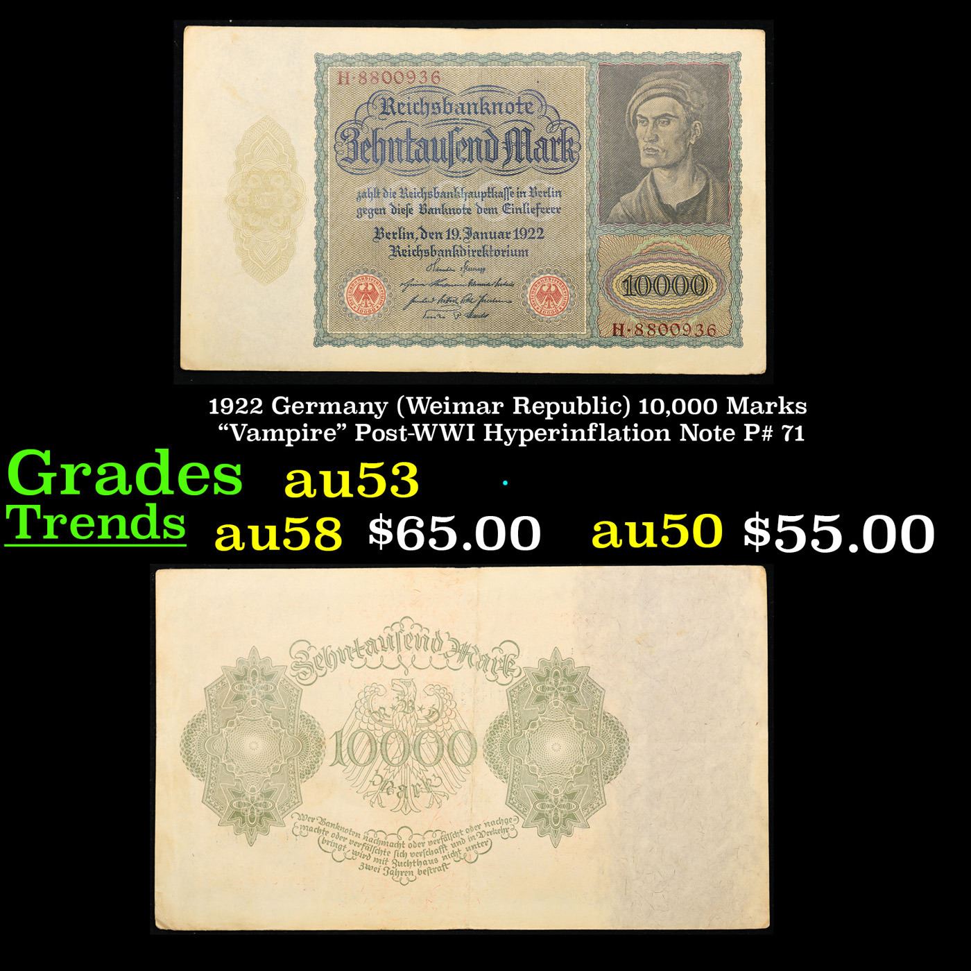 1922 Germany (Weimar Republic) 10,000 Marks "Vampire" Post-WWI Hyperinflation Note P# 71 Grades Select AU. Among the many bills issued during the hyperinflation crisis in the post-WWI German Weimar Republic, the "Vampire Note" is a particular standout. It is known as the Vampire Note because when the note's engraver (identity unknown) adapted a portrait by famous German Renaissance painter Albrecht Durer for the note, he made an odd alteration where the neck of the figure looks like a Vampire when the bill is rotated 90 degrees. It takes some imagination to see, but was intentional and meant to represent the anti-French sentiment in WWI Germany -- France was considered to be "sucking the life out of" the country following the signing of the Treaty of Versailles. The Reichsbank noticed this alteration, but did not change it, printing several varieties of the bill with the design and giving credence to the popular anti-French sentiment. There are three varieties, Pick # 70 and 71 differing in the reverse design, and Pick # 72 being a smaller version of Pick # 71.