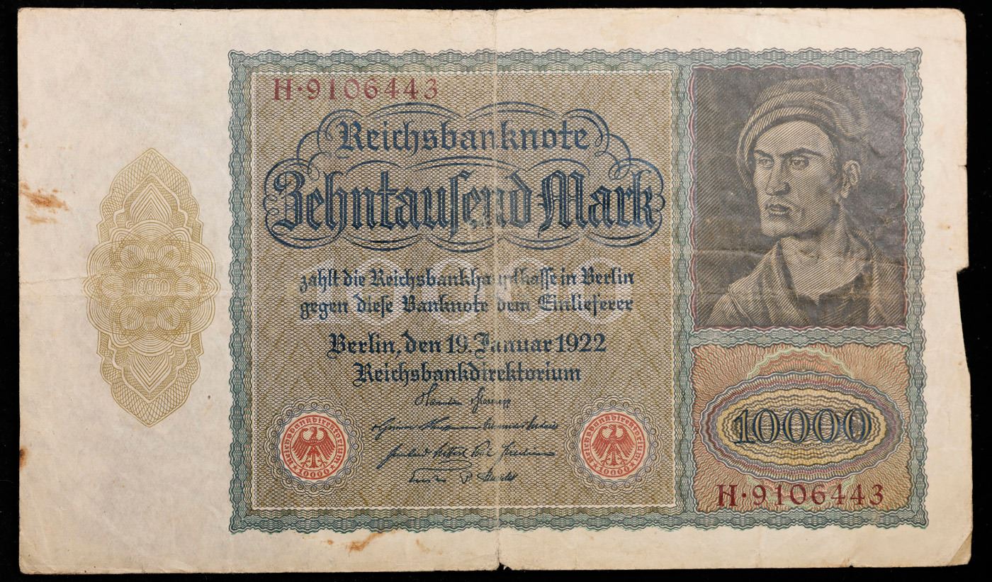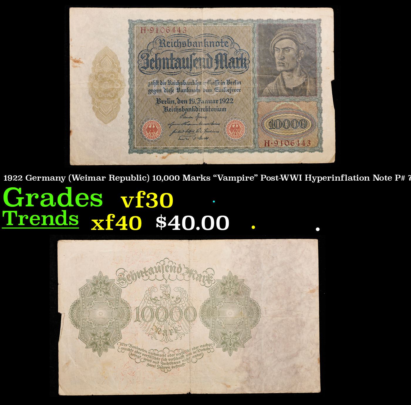 1922 Germany (Weimar Republic) 10,000 Marks "Vampire" Post-WWI Hyperinflation Note P# 71 Grades vf++. Among the many bills issued during the hyperinflation crisis in the post-WWI German Weimar Republic, the "Vampire Note" is a particular standout. It is known as the Vampire Note because when the note's engraver (identity unknown) adapted a portrait by famous German Renaissance painter Albrecht Durer for the note, he made an odd alteration where the neck of the figure looks like a Vampire when the bill is rotated 90 degrees. It takes some imagination to see, but was intentional and meant to represent the anti-French sentiment in WWI Germany -- France was considered to be "sucking the life out of" the country following the signing of the Treaty of Versailles. The Reichsbank noticed this alteration, but did not change it, printing several varieties of the bill with the design and giving credence to the popular anti-French sentiment. There are three varieties, Pick # 70 and 71 differing in the reverse design, and Pick # 72 being a smaller version of Pick # 71.