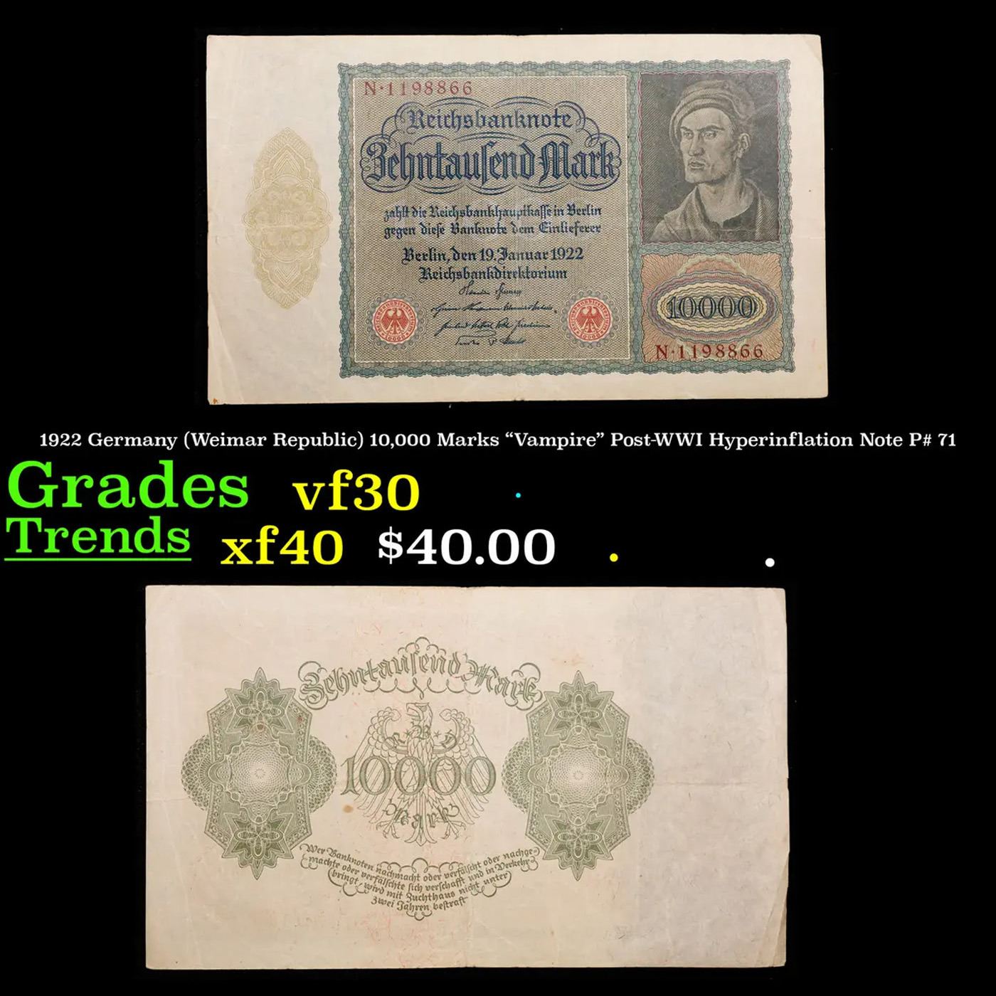 1922 Germany (Weimar Republic) 10,000 Marks "Vampire" Post-WWI Hyperinflation Note P# 71 Grades vf++. Among the many bills issued during the hyperinflation crisis in the post-WWI German Weimar Republic, the "Vampire Note" is a particular standout. It is known as the Vampire Note because when the note's engraver (identity unknown) adapted a portrait by famous German Renaissance painter Albrecht Durer for the note, he made an odd alteration where the neck of the figure looks like a Vampire when the bill is rotated 90 degrees. It takes some imagination to see, but was intentional and meant to represent the anti-French sentiment in WWI Germany -- France was considered to be "sucking the life out of" the country following the signing of the Treaty of Versailles. The Reichsbank noticed this alteration, but did not change it, printing several varieties of the bill with the design and giving credence to the popular anti-French sentiment. There are three varieties, Pick # 70 and 71 differing in the reverse design, and Pick # 72 being a smaller version of Pick # 71.