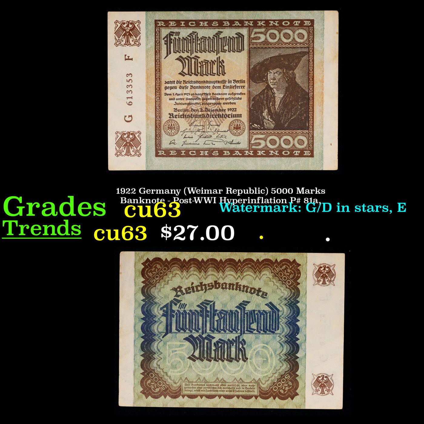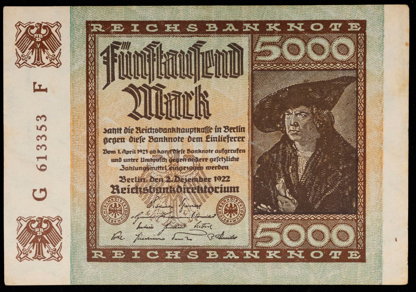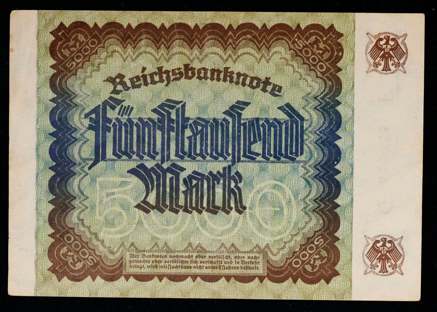 1922 Germany (Weimar Republic) 5000 Marks Banknote - Post-WWI Hyperinflation P# 81a, Grades Select CU. In the early 1920s, post-WWI Germany saw its economy spiraling out of control. Hyperinflation started directly after the war in 1918, but truly took over the Weimar Republic from 1921 to 1923. The value of the Mark declined incredibly rapidly. 1 USD was equal to 50 German Marks at the beginning of 1920. Toward the end of 1923, 1 USD was equal to over 4,200,000,000,000 German Marks. At times, denominations of the Mark became less valuable than the paper and labor to print it almost immediately after printing. Thus, denominations of the Mark notes became incredibly large, ending up in the tens of trillions.