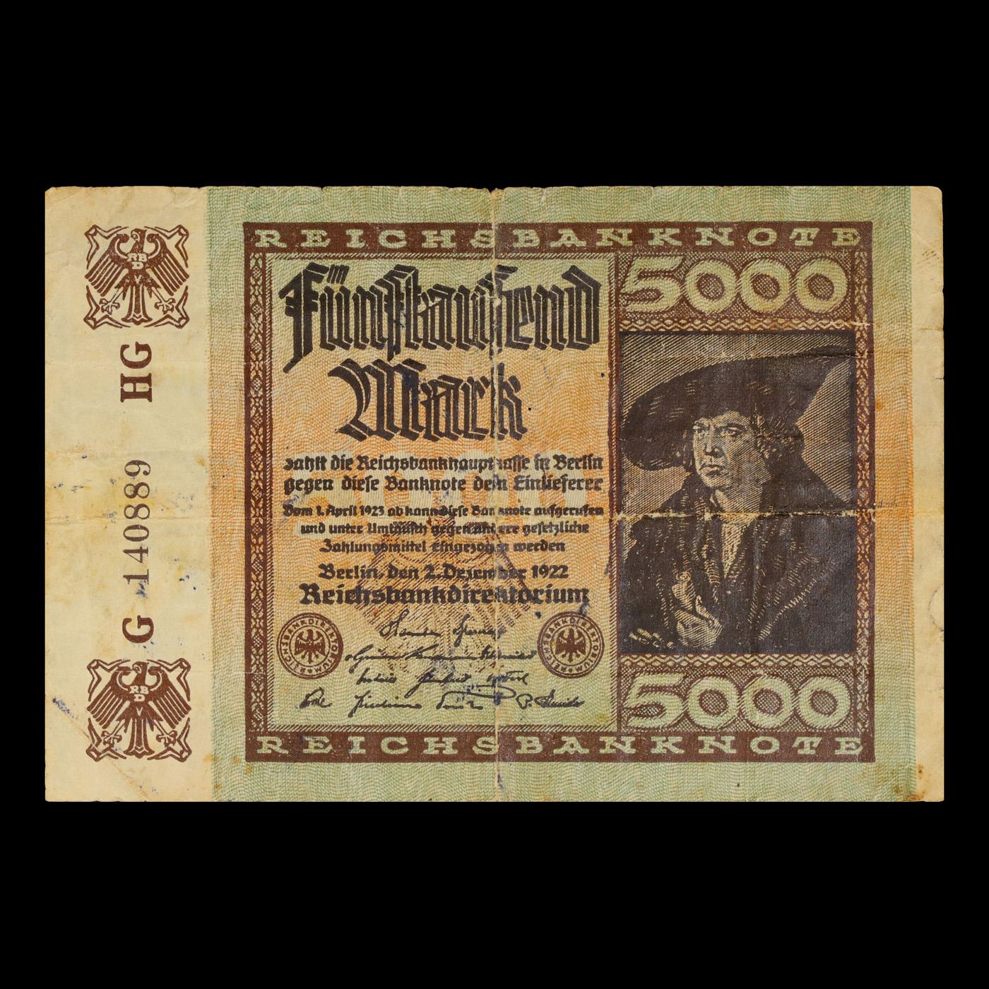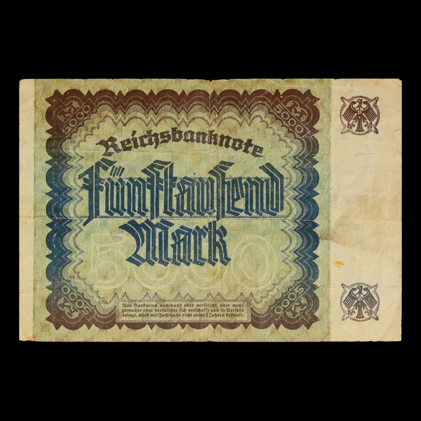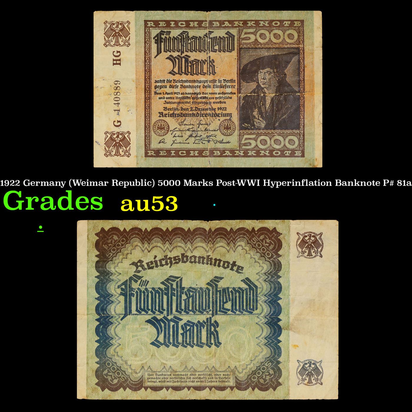 1922 Germany (Weimar Republic) 5000 Marks Post-WWI Hyperinflation Banknote P# 81a Grades Select AU. In the early 1920s, post-WWI Germany saw its economy spiraling out of control. Hyperinflation started directly after the war in 1918, but truly took over the Weimar Republic from 1921 to 1923. The value of the Mark declined incredibly rapidly. 1 USD was equal to 50 German Marks at the beginning of 1920. Toward the end of 1923, 1 USD was equal to over 4,200,000,000,000 German Marks. At times, denominations of the Mark became less valuable than the paper and labor to print it almost immediately after printing. Thus, denominations of the Mark notes became incredibly large, ending up in the tens of trillions.