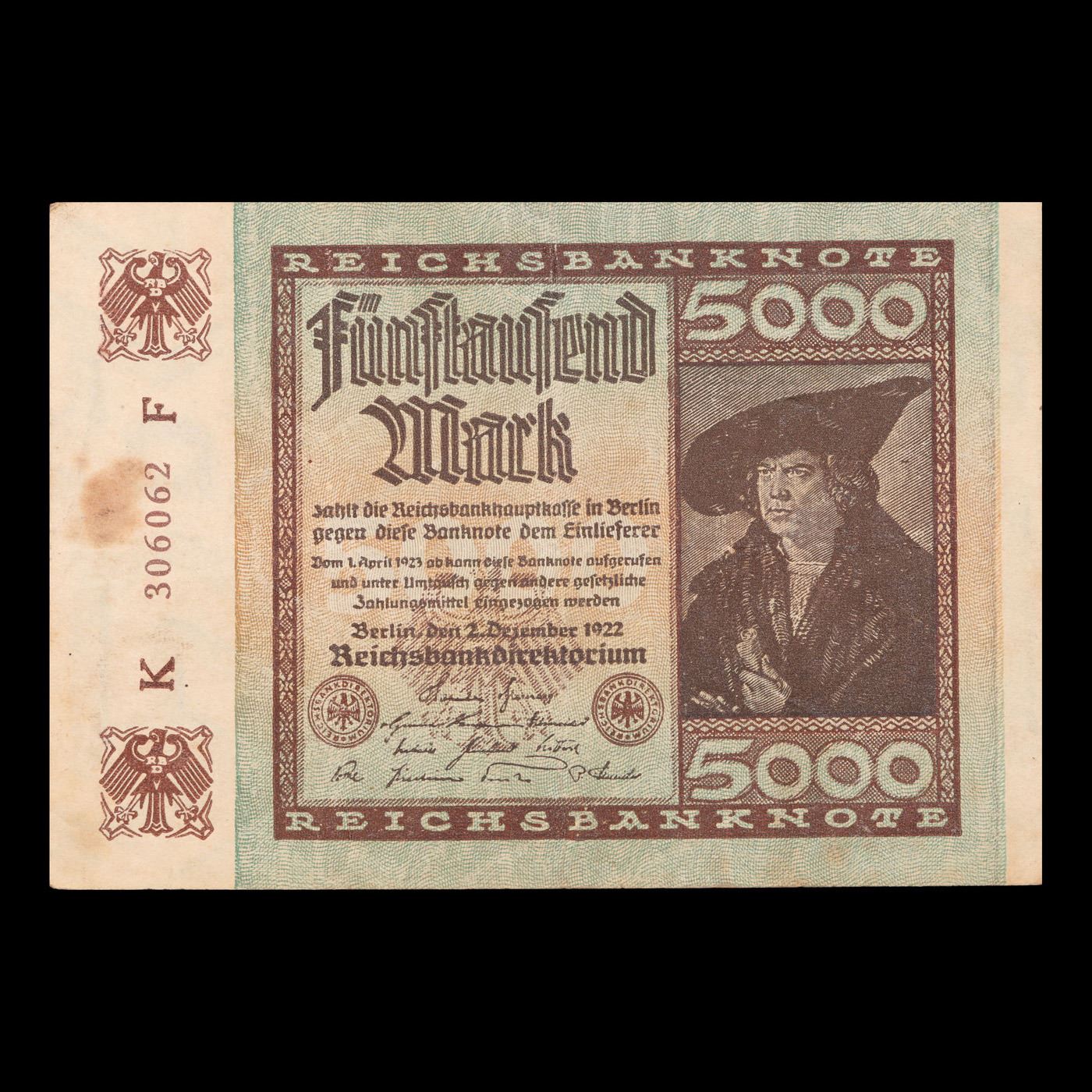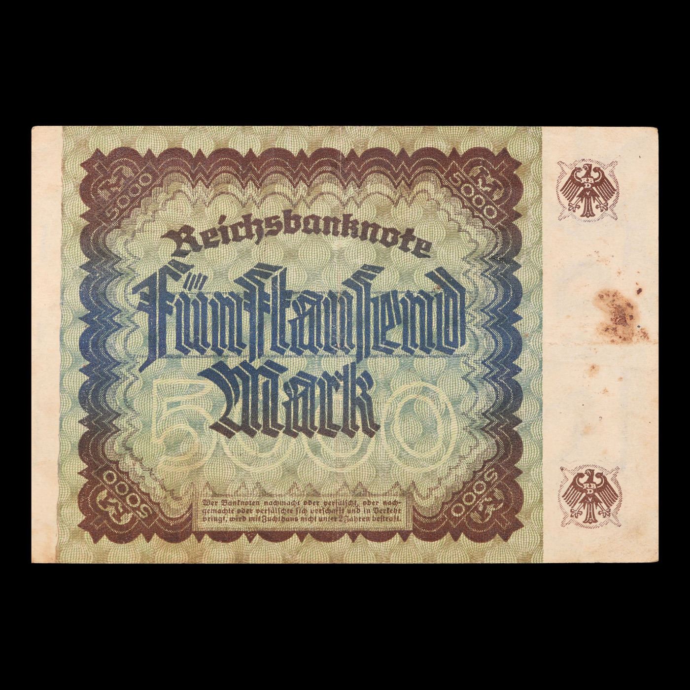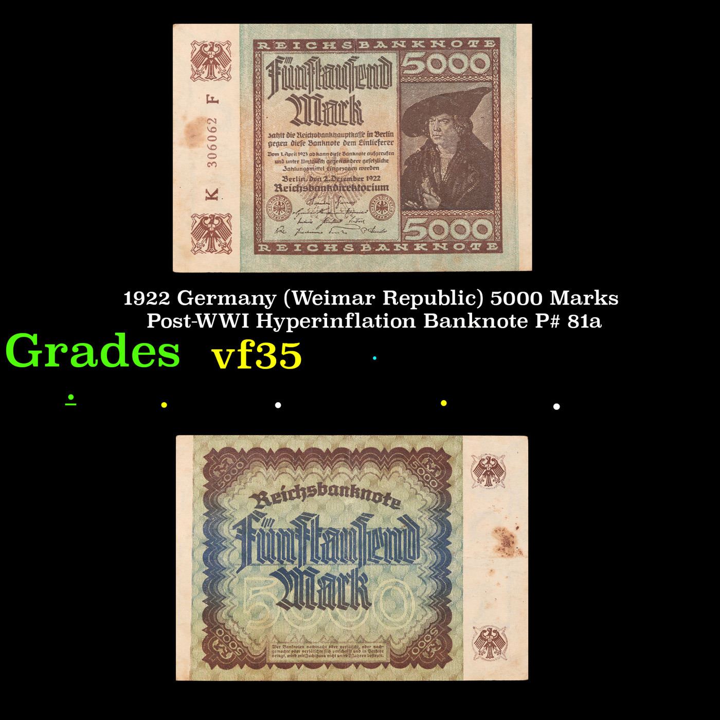 1922 Germany (Weimar Republic) 5000 Marks Post-WWI Hyperinflation Banknote P# 81a Grades vf++. In the early 1920s, post-WWI Germany saw its economy spiraling out of control. Hyperinflation started directly after the war in 1918, but truly took over the Weimar Republic from 1921 to 1923. The value of the Mark declined incredibly rapidly. 1 USD was equal to 50 German Marks at the beginning of 1920. Toward the end of 1923, 1 USD was equal to over 4,200,000,000,000 German Marks. At times, denominations of the Mark became less valuable than the paper and labor to print it almost immediately after printing. Thus, denominations of the Mark notes became incredibly large, ending up in the tens of trillions.