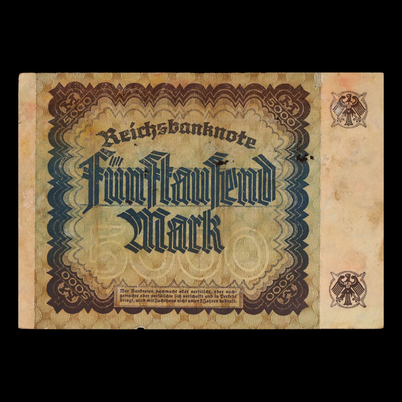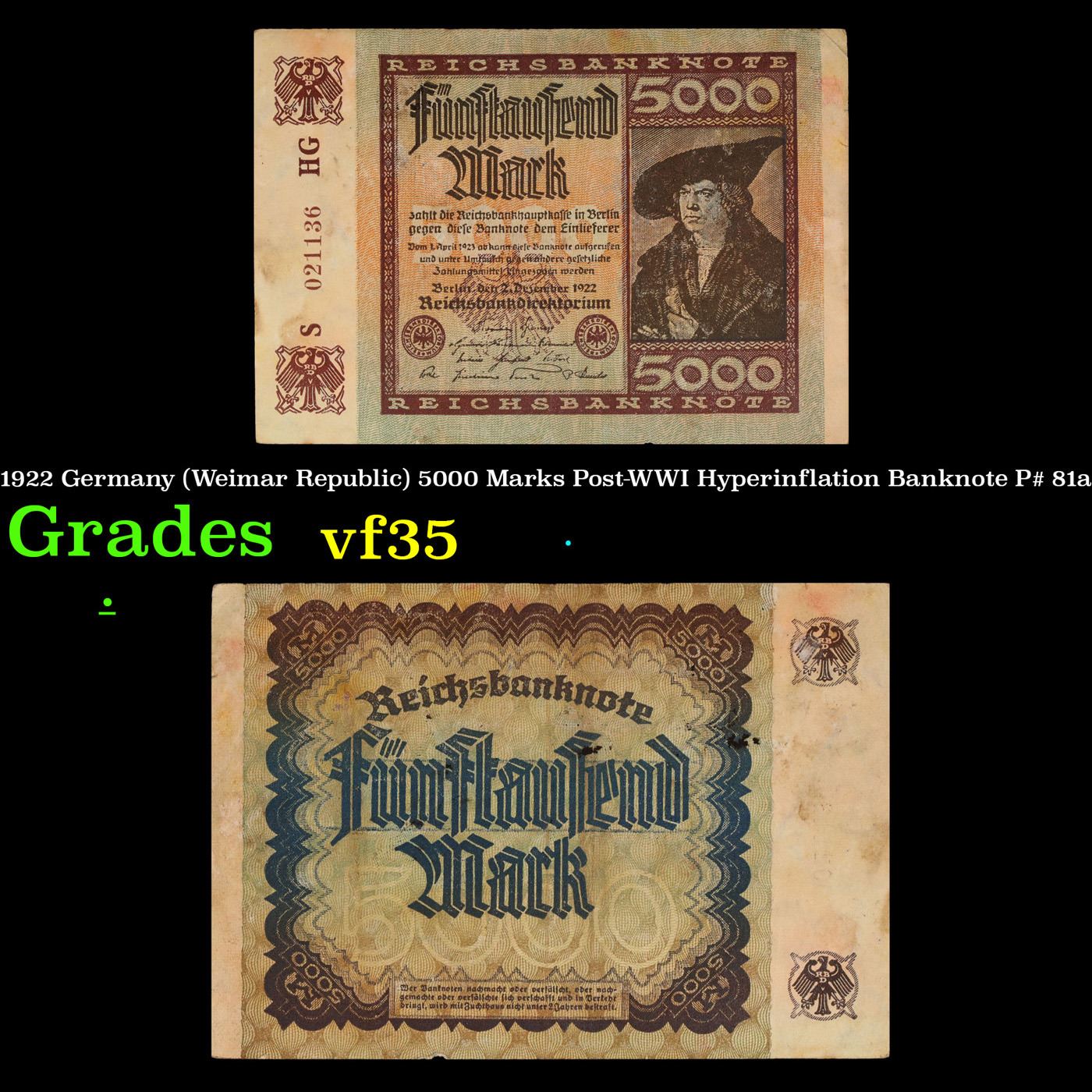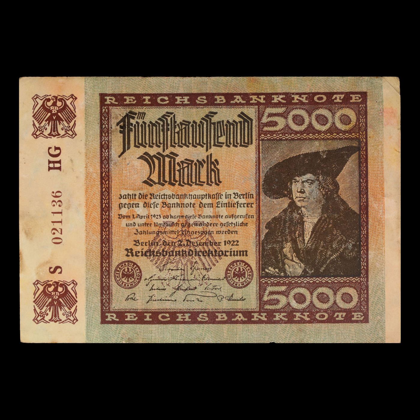 1922 Germany (Weimar Republic) 5000 Marks Post-WWI Hyperinflation Banknote P# 81a Grades vf++. In the early 1920s, post-WWI Germany saw its economy spiraling out of control. Hyperinflation started directly after the war in 1918, but truly took over the Weimar Republic from 1921 to 1923. The value of the Mark declined incredibly rapidly. 1 USD was equal to 50 German Marks at the beginning of 1920. Toward the end of 1923, 1 USD was equal to over 4,200,000,000,000 German Marks. At times, denominations of the Mark became less valuable than the paper and labor to print it almost immediately after printing. Thus, denominations of the Mark notes became incredibly large, ending up in the tens of trillions.
