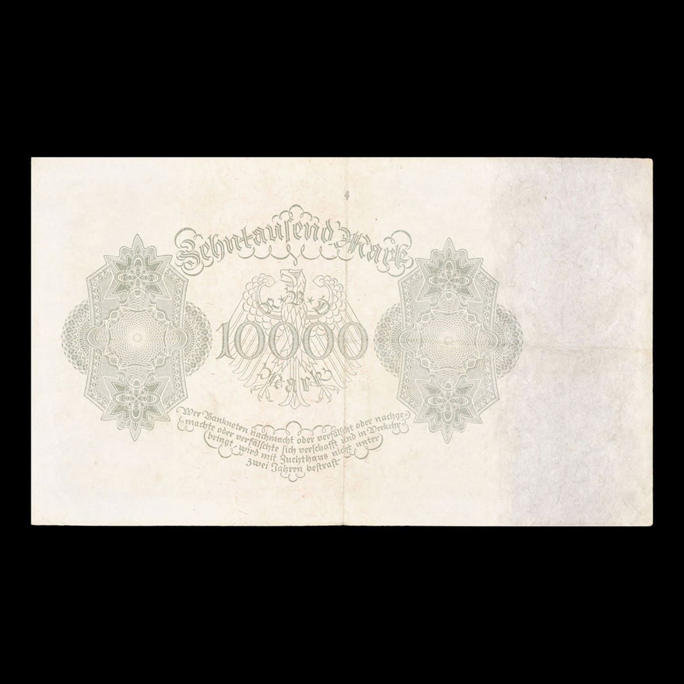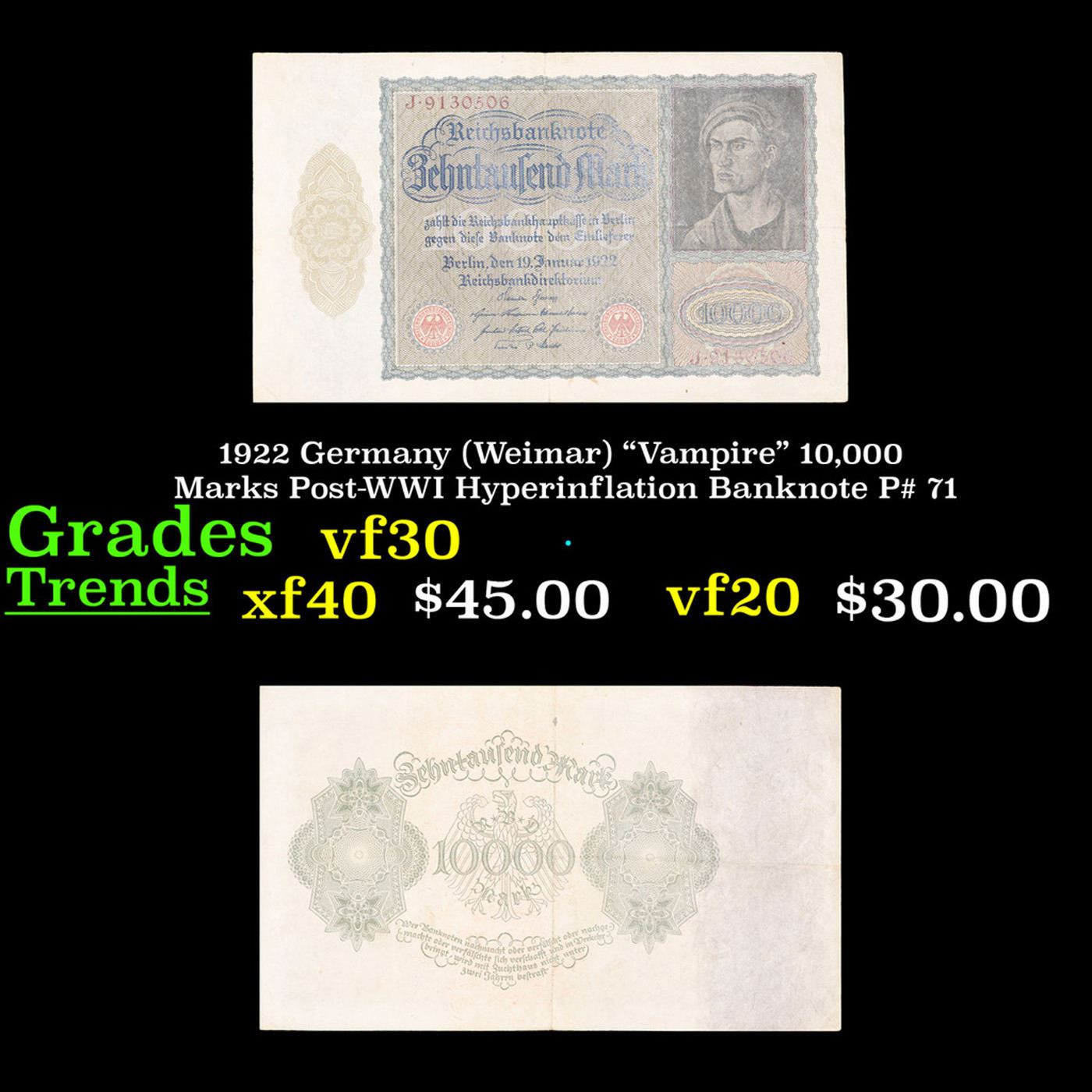 1922 Germany (Weimar) "Vampire" 10,000 Marks Post-WWI Hyperinflation Banknote P# 71 Grades vf++. Among the many bills issued during the hyperinflation crisis in the post-WWI German Weimar Republic, the "Vampire Note" is a particular standout. It is known as the Vampire Note because when the note's engraver (identity unknown) adapted a portrait by famous German Renaissance painter Albrecht Durer for the note, he made an odd alteration where the neck of the figure looks like a Vampire when the bill is rotated 90 degrees. It takes some imagination to see, but was intentional and meant to represent the anti-French sentiment in WWI Germany -- France was considered to be "sucking the life out of" the country following the signing of the Treaty of Versailles. The Reichsbank noticed this alteration, but did not change it, printing several varieties of the bill with the design and giving credence to the popular anti-French sentiment. There are three varieties, Pick # 70 and 71 differing in the reverse design, and Pick # 72 being a smaller version of Pick # 71.