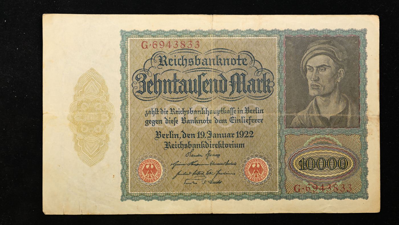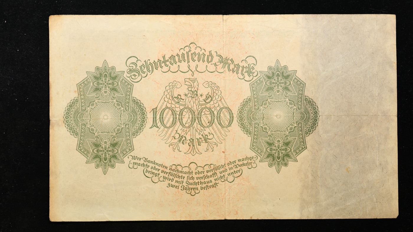 1922 Germny 10,000 Mark Vampire Note P# 71 Grades vf++. Among the many bills issued during the hyperinflation crisis in the post-WWI German Weimar Republic, the "Vampire Note" is a particular standout. It is known as the Vampire Note because when the note's engraver (identity unknown) adapted a portrait by famous German Renaissance painter Albrecht Durer for the note, he made an odd alteration where the neck of the figure looks like a Vampire when the bill is rotated 90 degrees. It takes some imagination to see, but was intentional and meant to represent the anti-French sentiment in WWI Germany -- France was considered to be "sucking the life out of" the country following the signing of the Treaty of Versailles. The Reichsbank noticed this alteration, but did not change it, printing several varieties of the bill with the design and giving credence to the popular anti-French sentiment. There are three varieties, Pick # 70 and 71 differing in the reverse design, and Pick # 72 being a smaller version of Pick # 71.