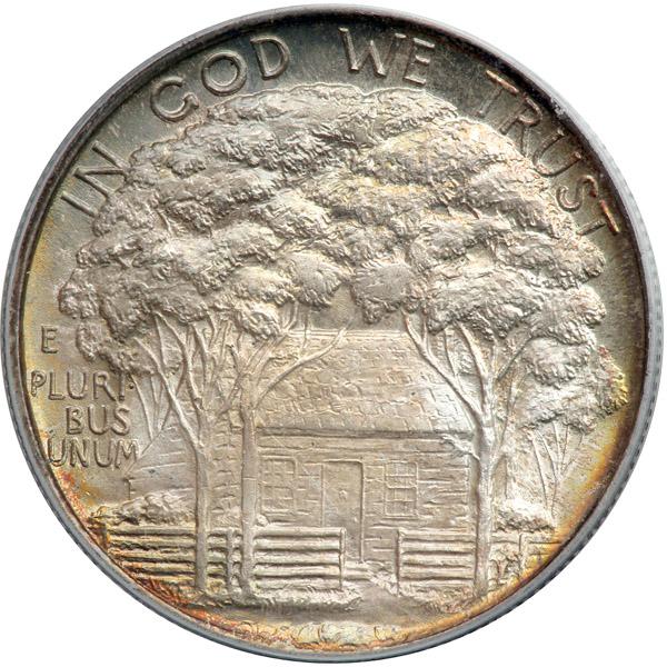 1922 Grant Half Dollar, No Star. PCGS graded MS-66 PQ. Impressive natural rainbow toning. A coin that could be a run-a-way. Stored in an old brown envelope for over 60 years. Ulysses S. Grant, Civil War general and later president, died in 1885. His birth in 1822 is commemorated here by the artist Laura Gardin Fraser after a photograph by the famed Civil War photographer, Matthew Brady. Grant was born in a traditional frame house of the period, but this has come down to us as a "log cabin." The house depicted is correct (PCGS # 9306) .