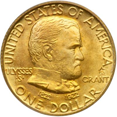 1922 Grant Gold Dollar, with star. PCGS graded MS-66. Rich golden toning. Only 5,016 minted. A boldly struck gold-surfaced coin whose high-end depth of detail in the portrait complements the equally fresh mint bloom. Where an ineffectual imprint is sometimes left by the rebound of the dies that struck certain Commemorative gold pieces, the opposite is in fact the Grant Dollar here: devices show crystal clarity and all the fine detail in the centers. Bidders be advised, you may face strong competition. A coin that has everything going for it (PCGS # 7459).