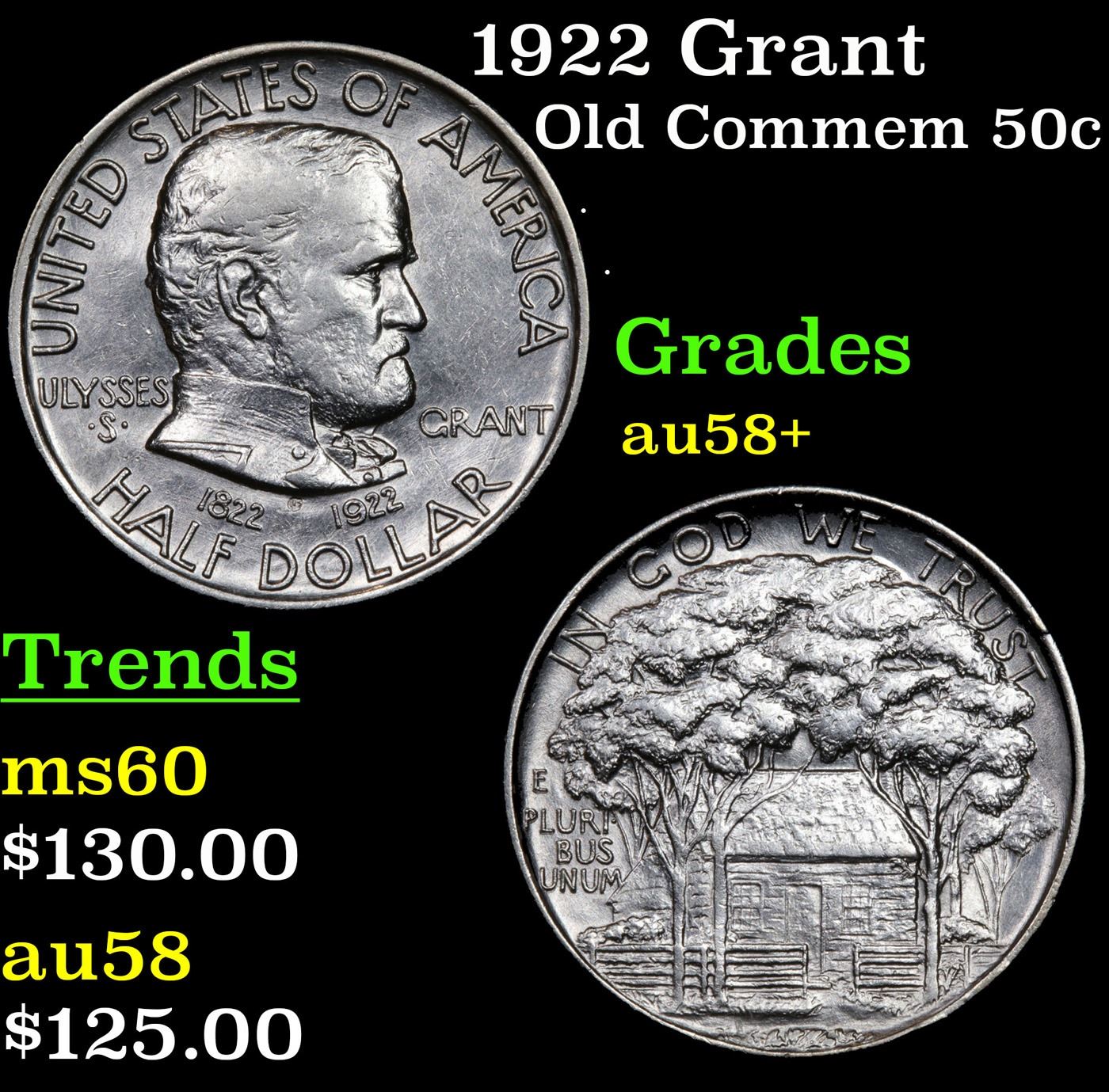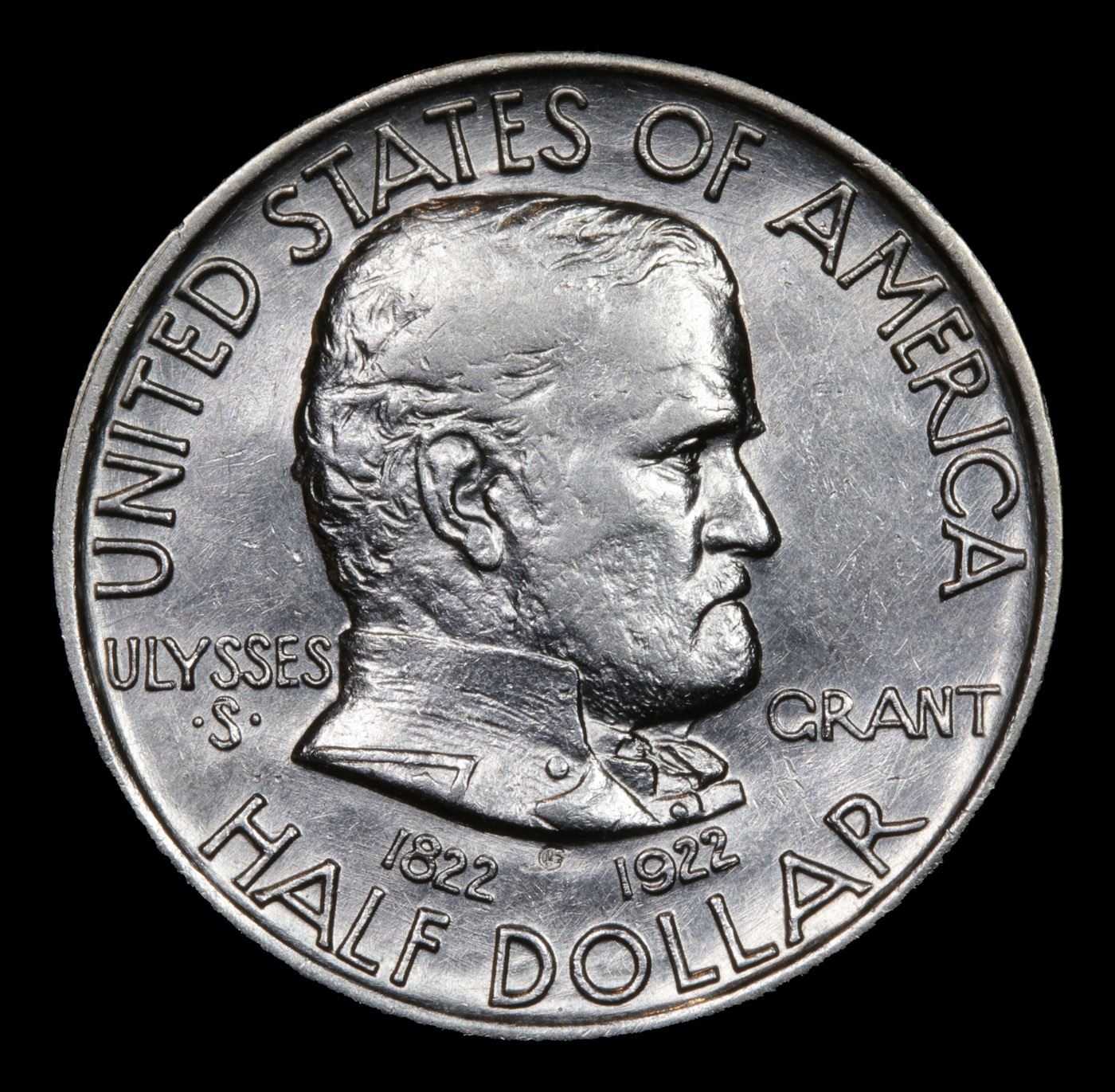 1922 Grant Old Commem Half Dollar 50c Grades Choice AU/BU Slider+. This is one of the Most Liked Commemoratives in the Entire Series! The Grant Halves are Notoriously Difficult to Grade, partly because Raised Die Lines on the Obverse Look at First Glance like Hairlines or Scratches. Points to check for wear include Grant’s Cheek and the Hair Above His Ear. The Reverse’s Dense Design Tends to mask imperfections and wear, but light friction often can be Detected in the Treetops. A Scarce and Sought After Commemorative!