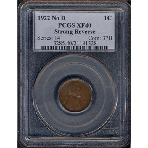 <b>1922 Lincoln Cent. No D. Strong reverse. PCGS graded EF40.</b> The more desirable variety of this interesting no-mintmark coin, the reverse die is in excellent shape compared to the much weaker Weak reverse that collectors usually shake their heads at. The obverse on both varieties is from a well worn die. Clean surfaces with only a few light circulation marks here and there <b>(PCGS # 3285)</b>