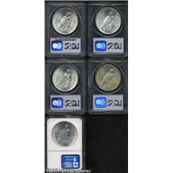<B>1922<img border='0' src='http://www.heritagecoins.com/images/star.gif' width=10 height=10>$1 MS65 PCGS; 1923 MS65 PCGS; 1924 MS65 NGC; 1925 MS65 PCGS;</B></I> and a <B>1926 MS65 PCGS,</B></I> all are fully brilliant except the 1926 which has some golden-gray patina over each side. A sharp Gem group of common date Peace Dollars. 5 Coins Lot:10685