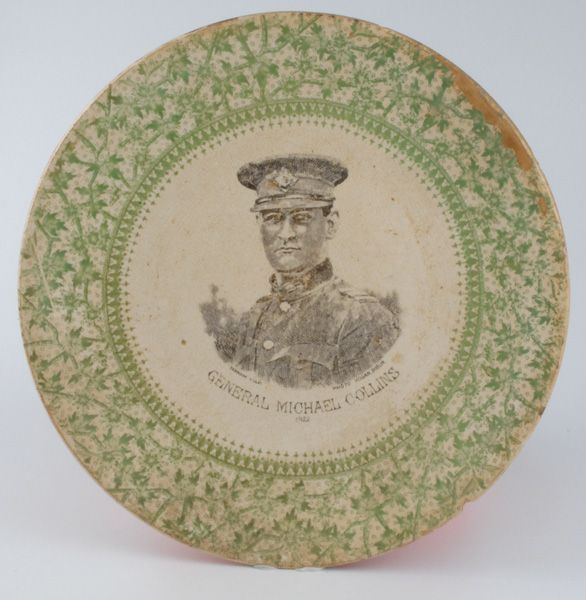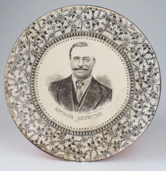 Scarce commemorative plates produced shortly after the deaths of both leaders. Based on photos by Hogan, Dublin. Collins plate with green border 10 inches (25 cm) diameter. Griffith plate with black border 9 inches (23 cm) diameter.