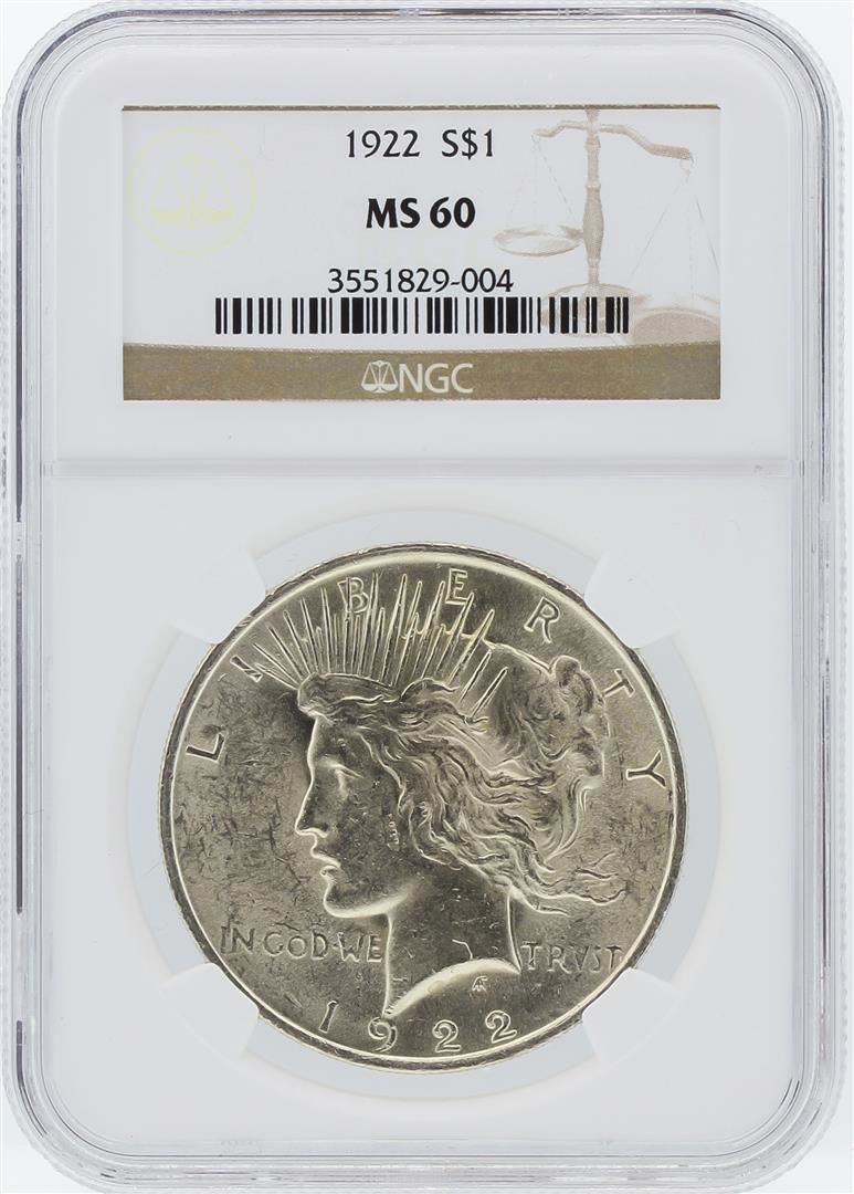 One 1922 NGC MS60 Peace Silver Dollar. NGC Certified.