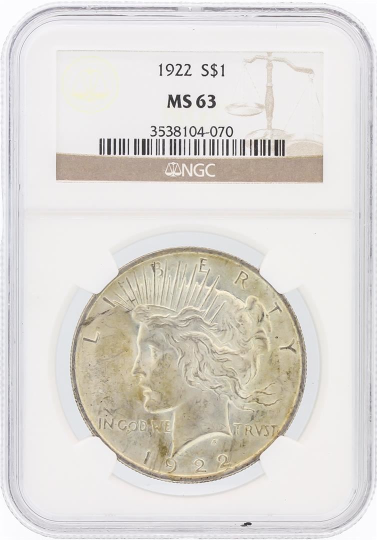 One 1922 NGC MS63 Peace Silver Dollar. NGC Certified.