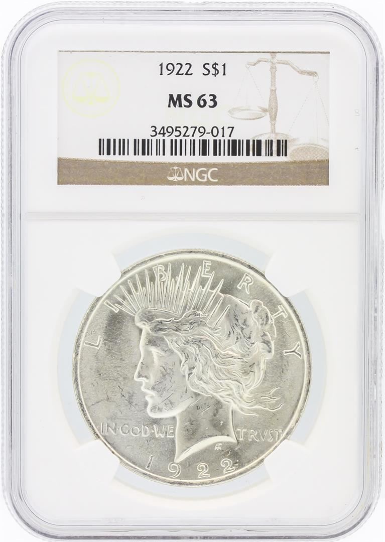 One 1922 NGC MS63 Peace Silver Dollar. NGC Certified.