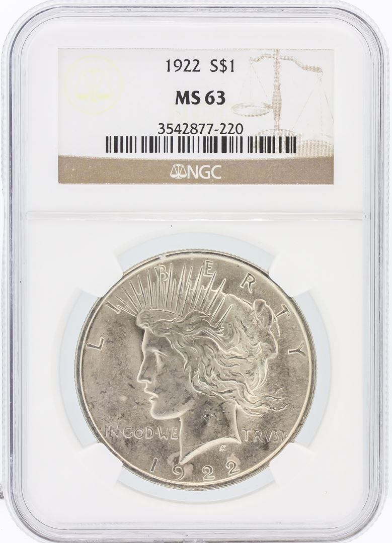 One 1922 NGC MS63 Peace Silver Dollar. NGC Certified.