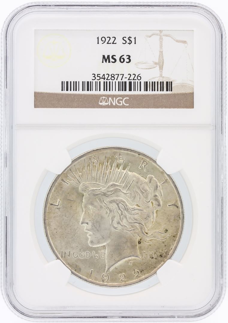 One 1922 NGC MS63 Peace Silver Dollar. NGC Certified.