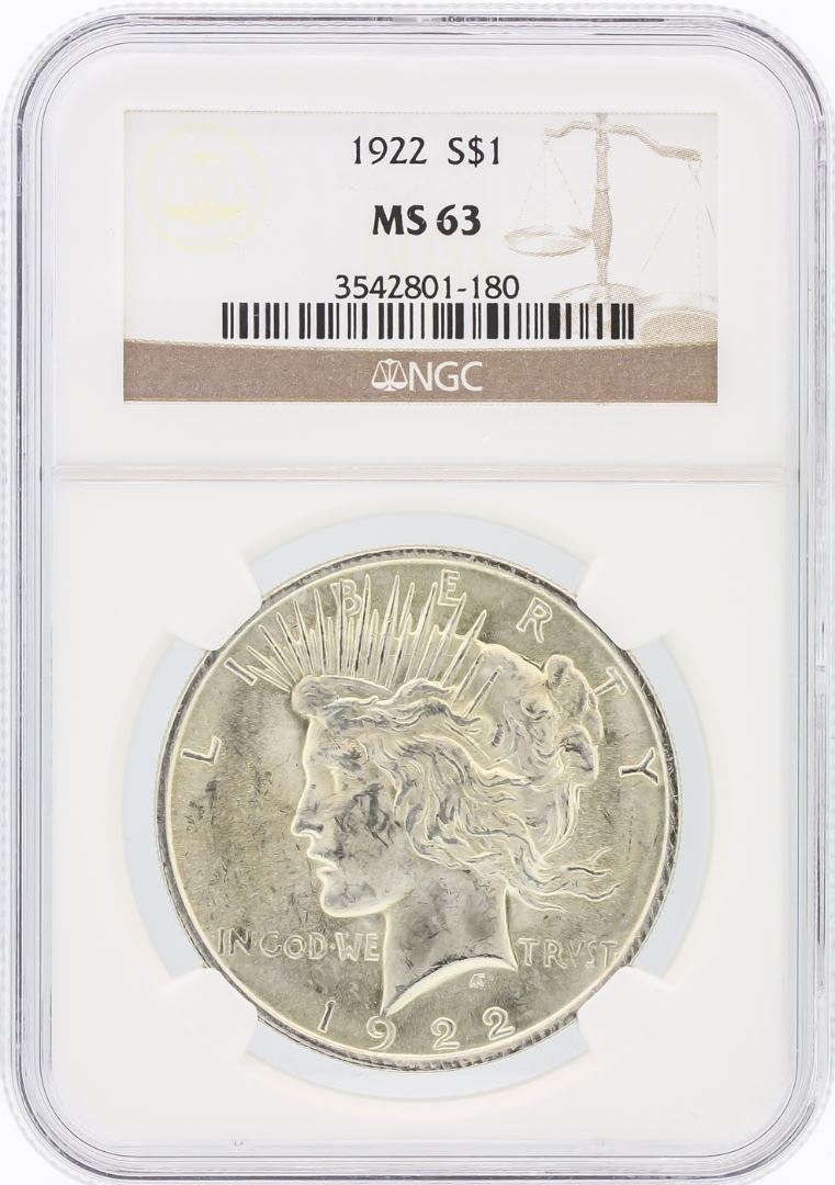 One 1922 NGC MS63 Peace Silver Dollar. NGC Certified.